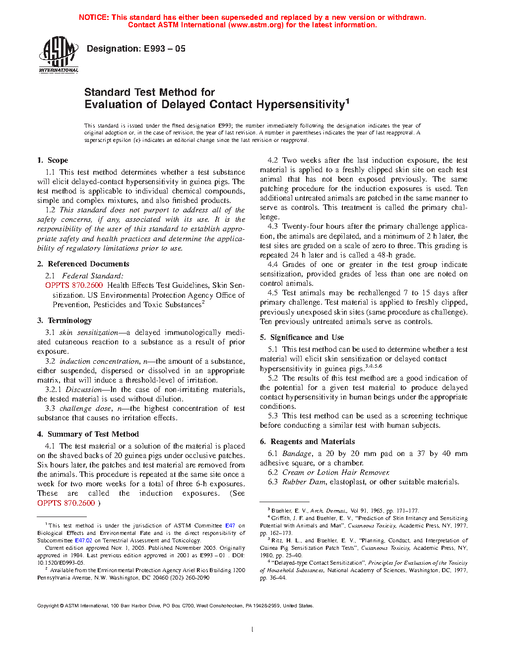 1.1 This test method determines whether a test substance will elicit delayed-contact hypersensitivity in guinea pigs. The test method is applicable to individual chemical compounds, simple and complex mixtures, and also finished products.