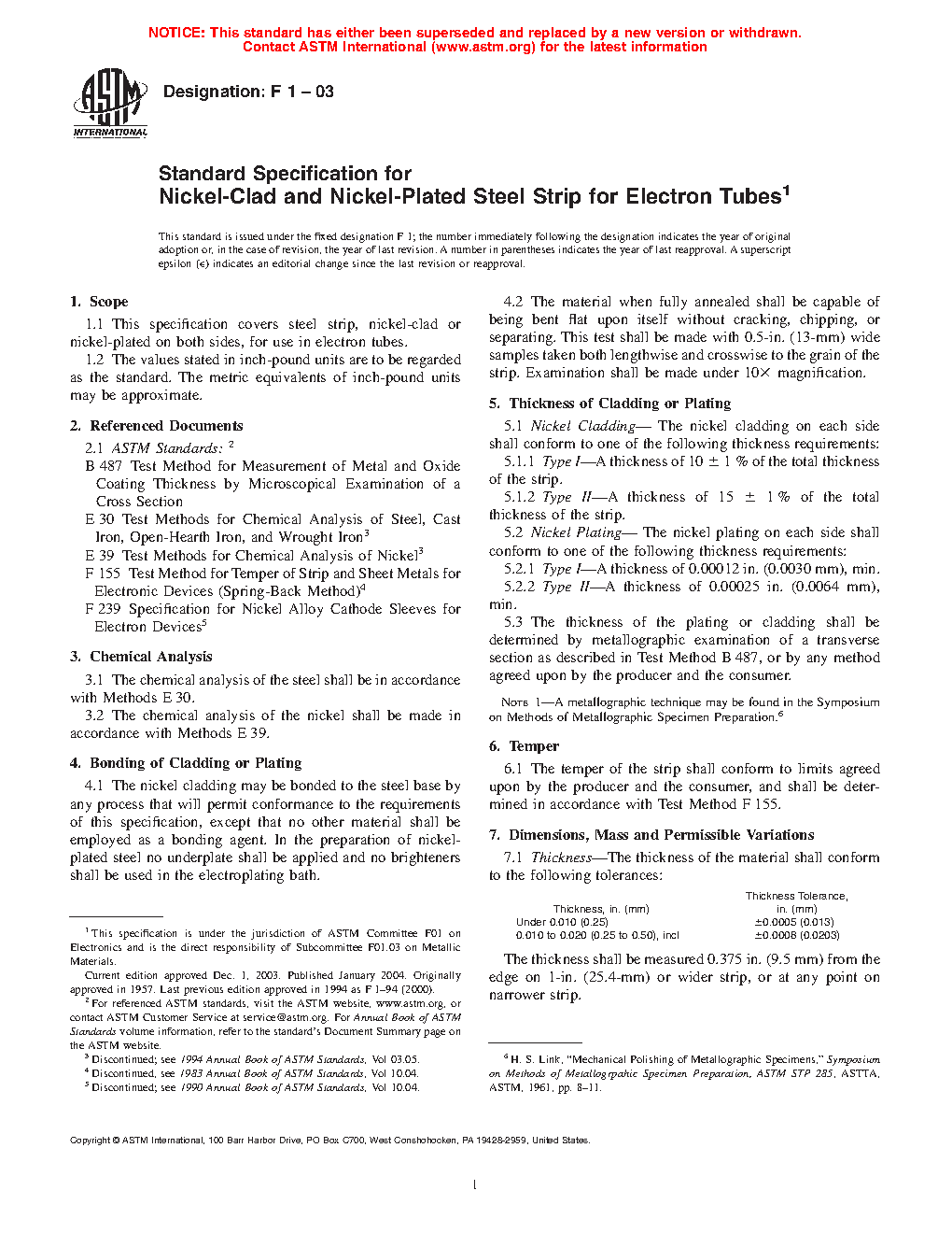 1.1 This specification covers steel strip, nickel-clad or nickel-plated on both sides, for use in electron tubes.