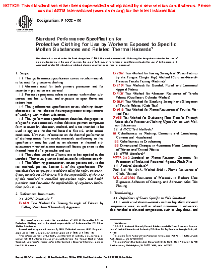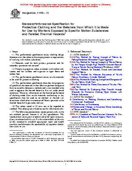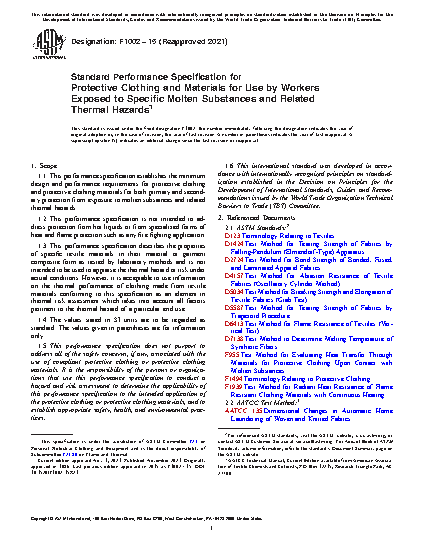 1.1 This performance specification establishes the minimum design and performance requirements for protective clothing and protective clothing materials for both primary and secondary protection from exposure to molten substances and related thermal hazards.