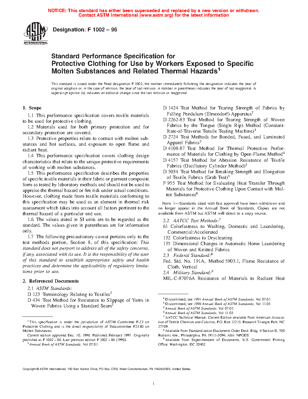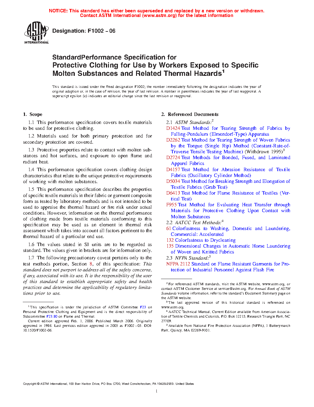 4.1 This specification establishes minimum design, performance, and labeling criteria for both primary and secondary protective clothing for use in operations involving molten substances and related thermal hazards.