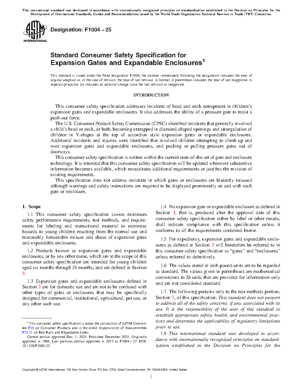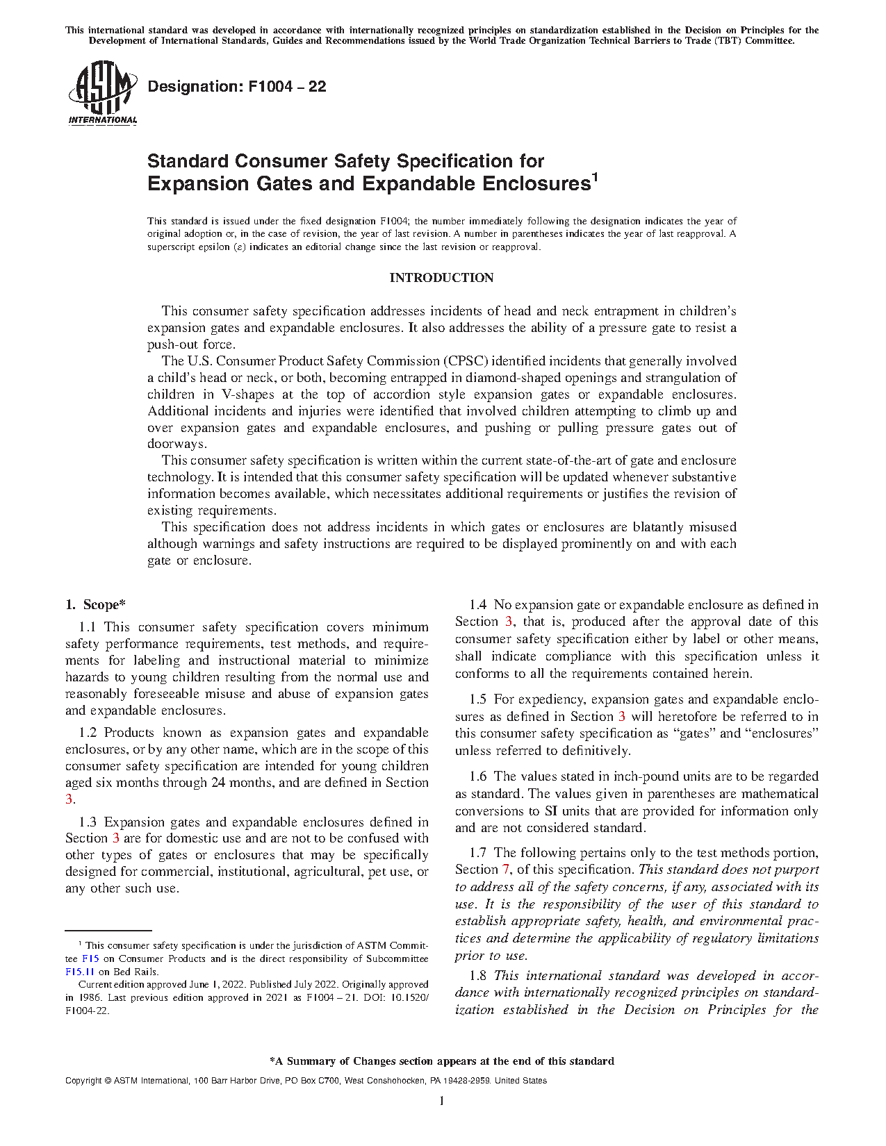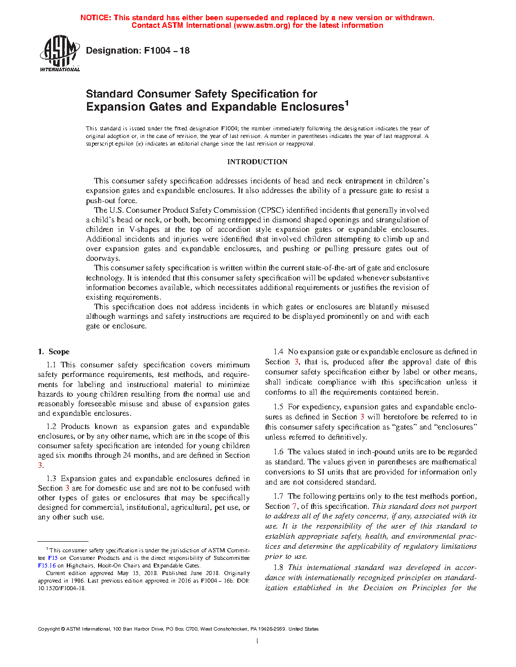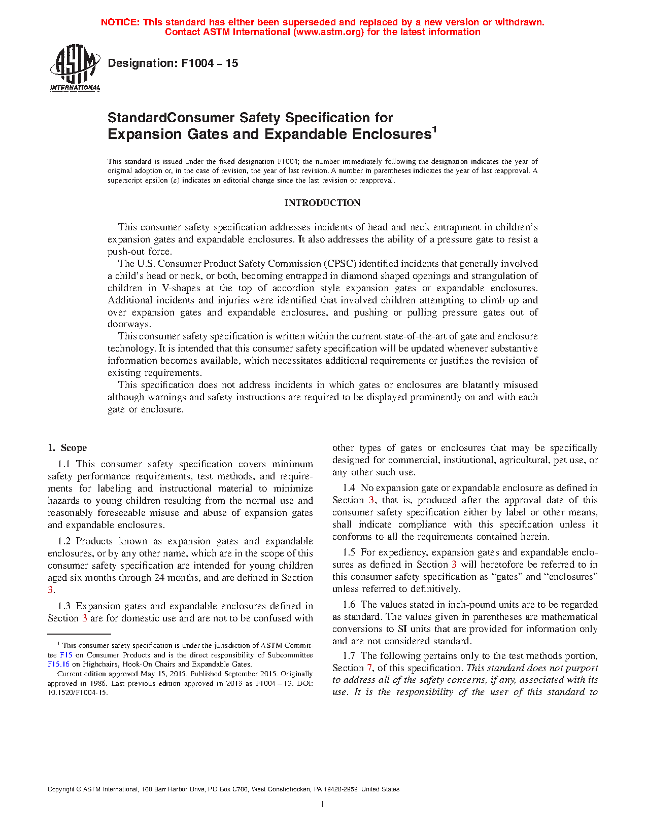 1.1 This consumer safety specification covers minimum safety performance requirements, test methods, and requirements for labeling and instructional material to minimize hazards to young children resulting from the normal use and reasonably foreseeable misuse and abuse of expansion gates and expandable enclosures.