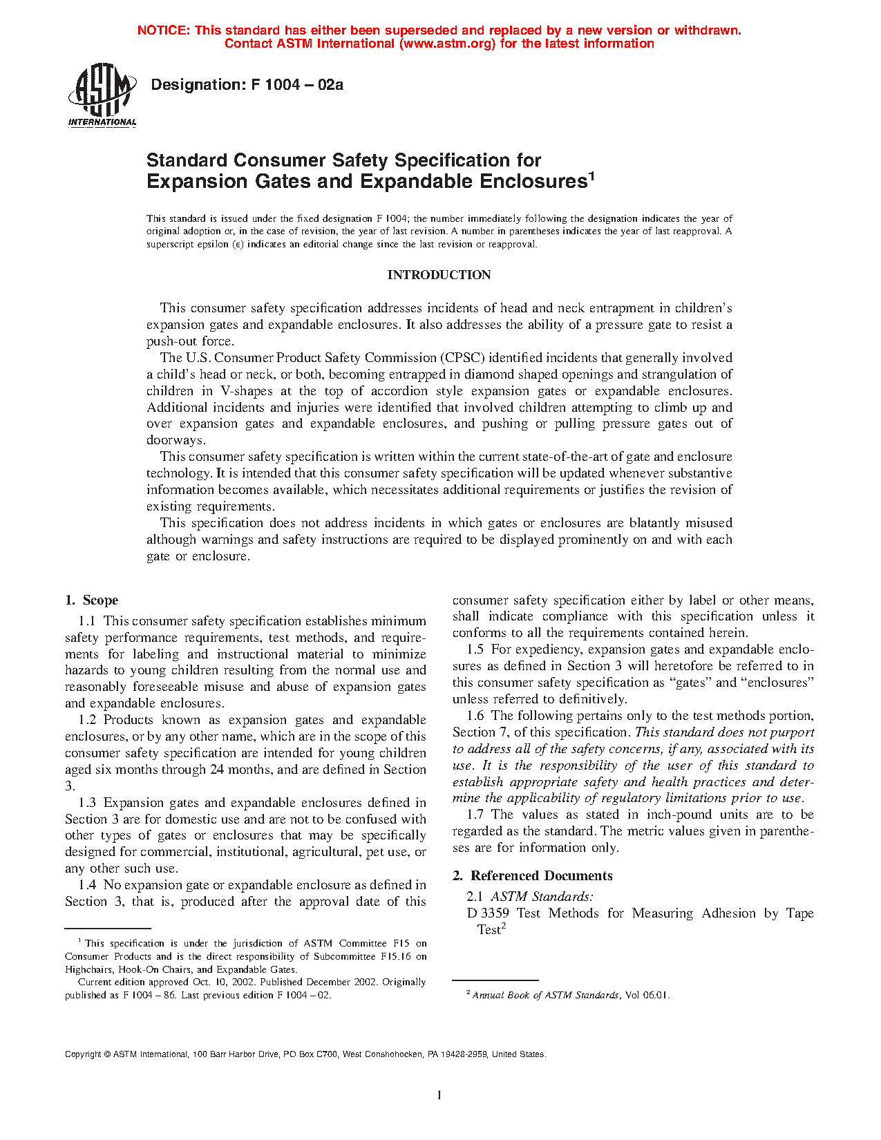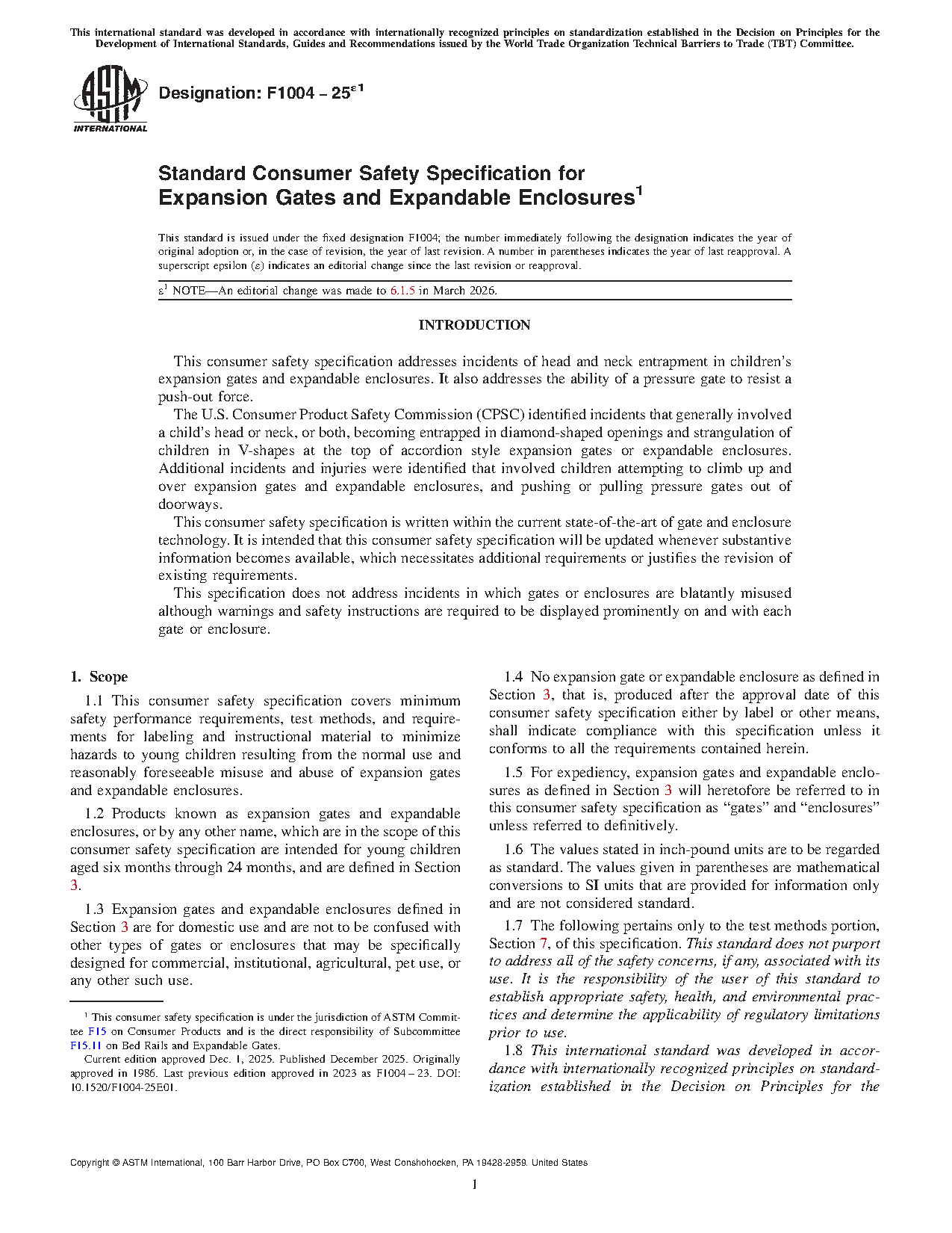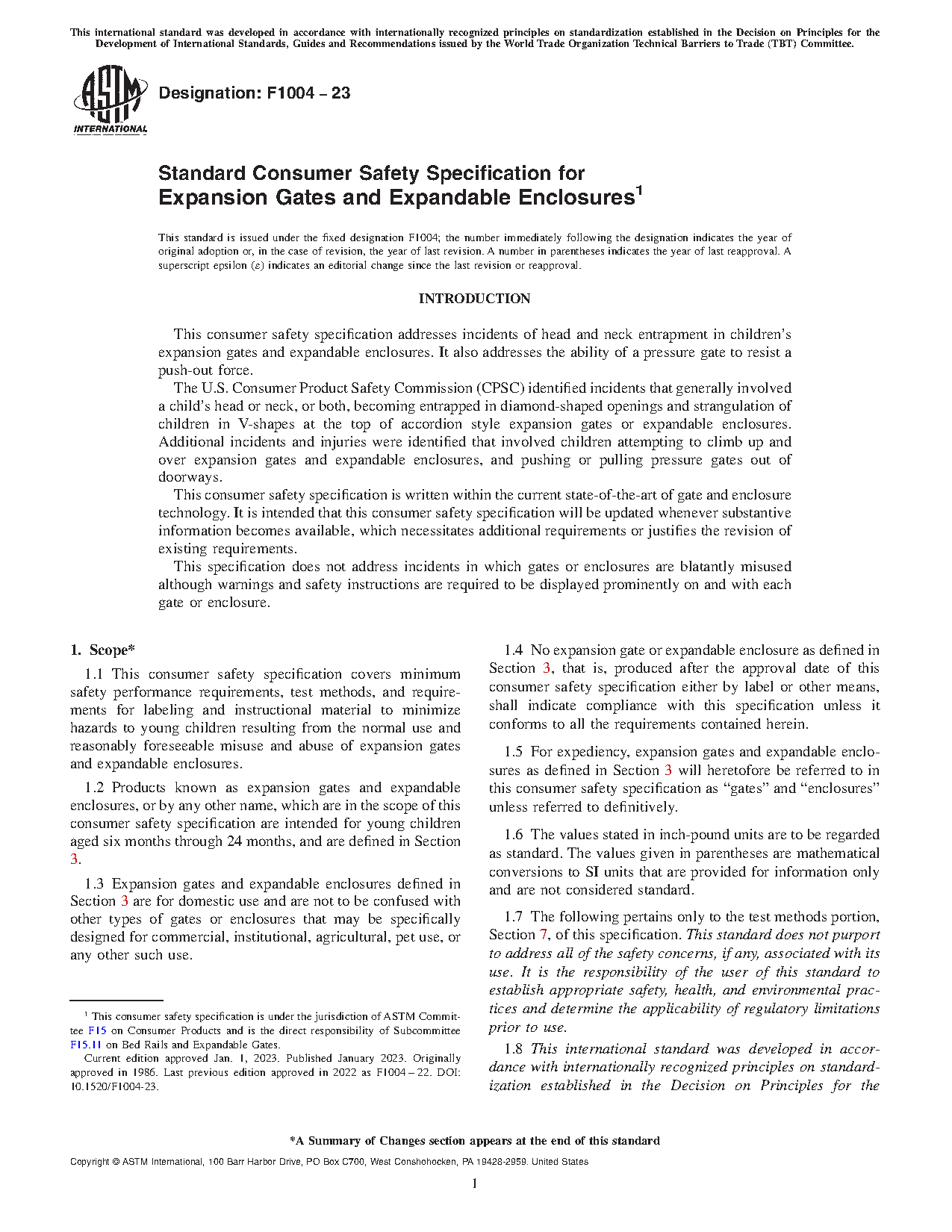 1.1 This consumer safety specification covers minimum safety performance requirements, test methods, and requirements for labeling and instructional material to minimize hazards to young children resulting from the normal use and reasonably foreseeable misuse and abuse of expansion gates and expandable enclosures.
