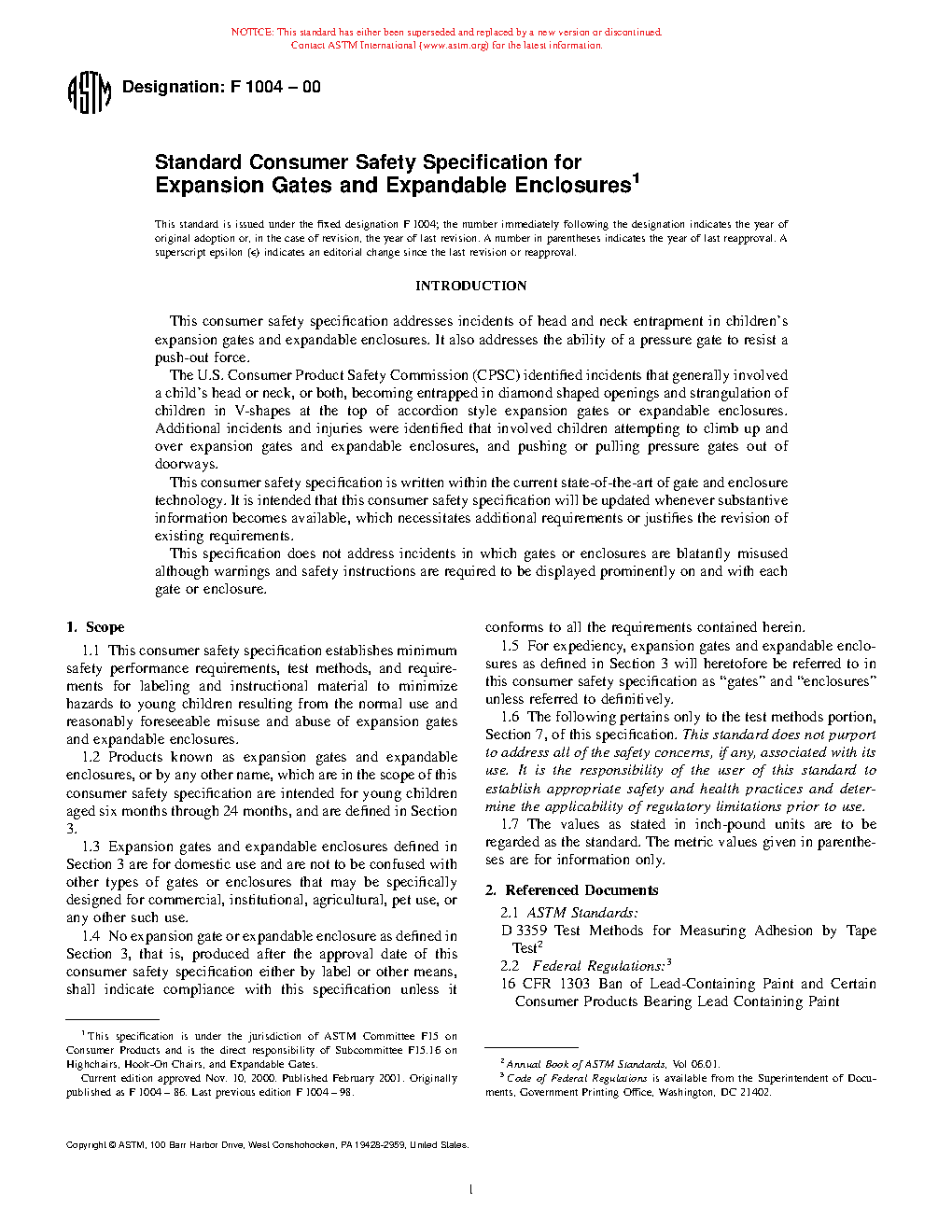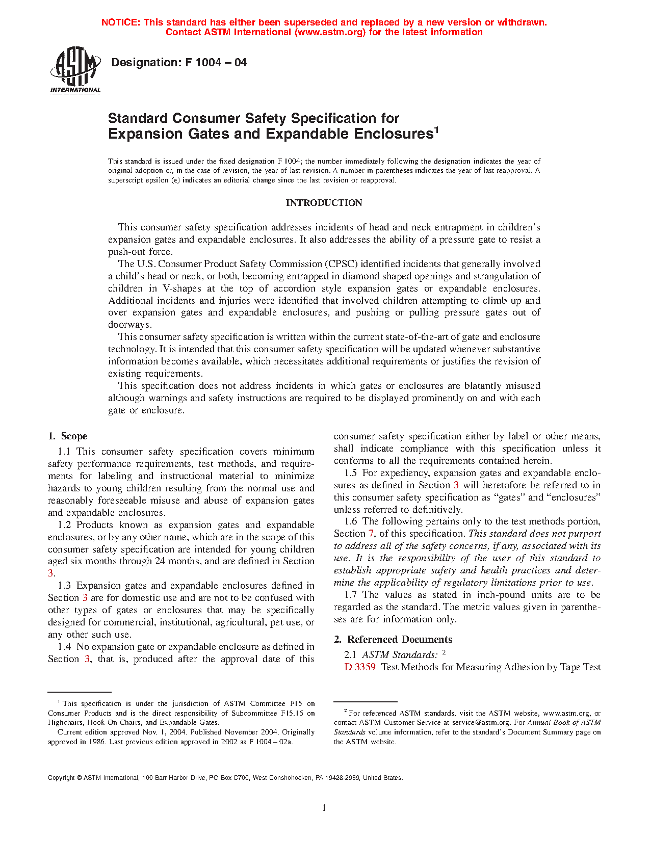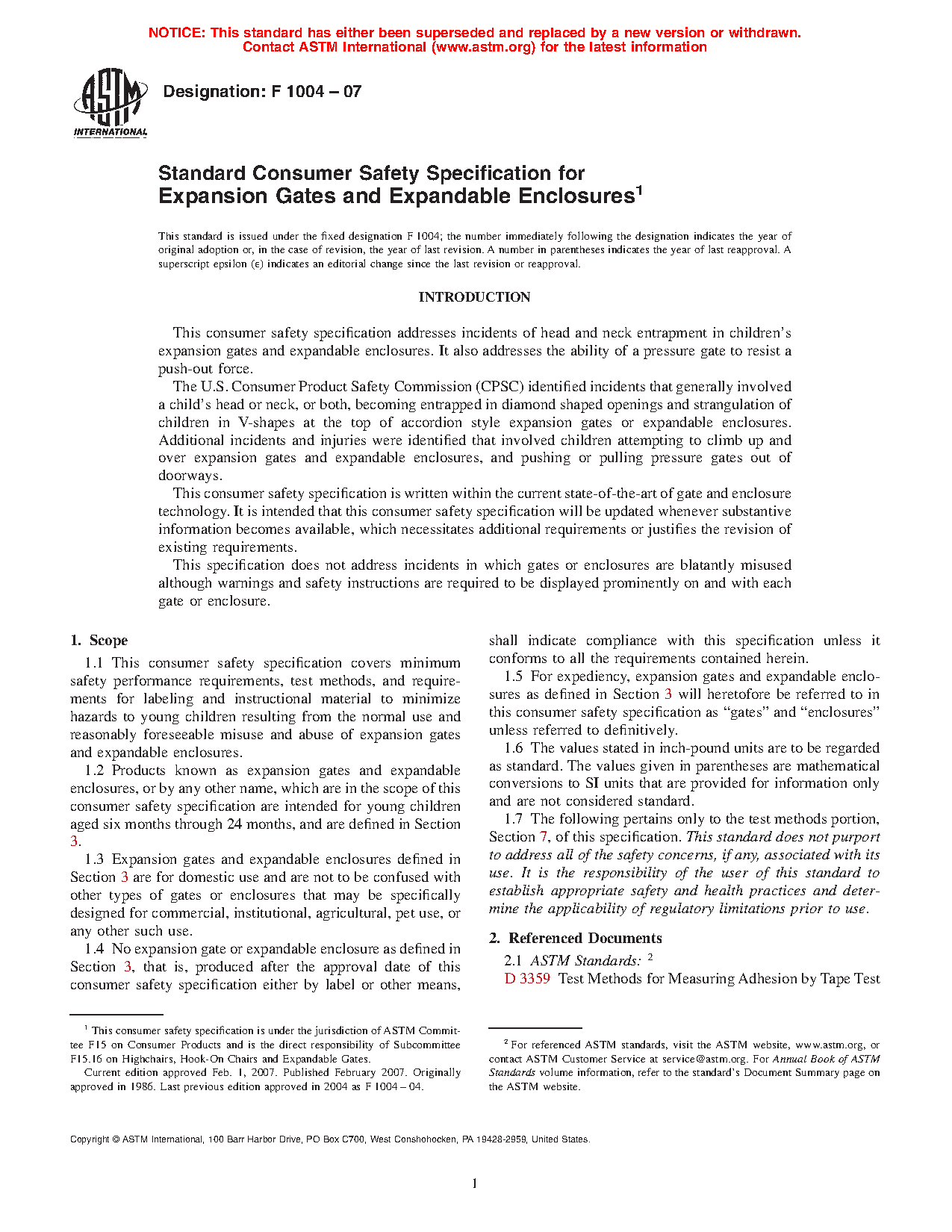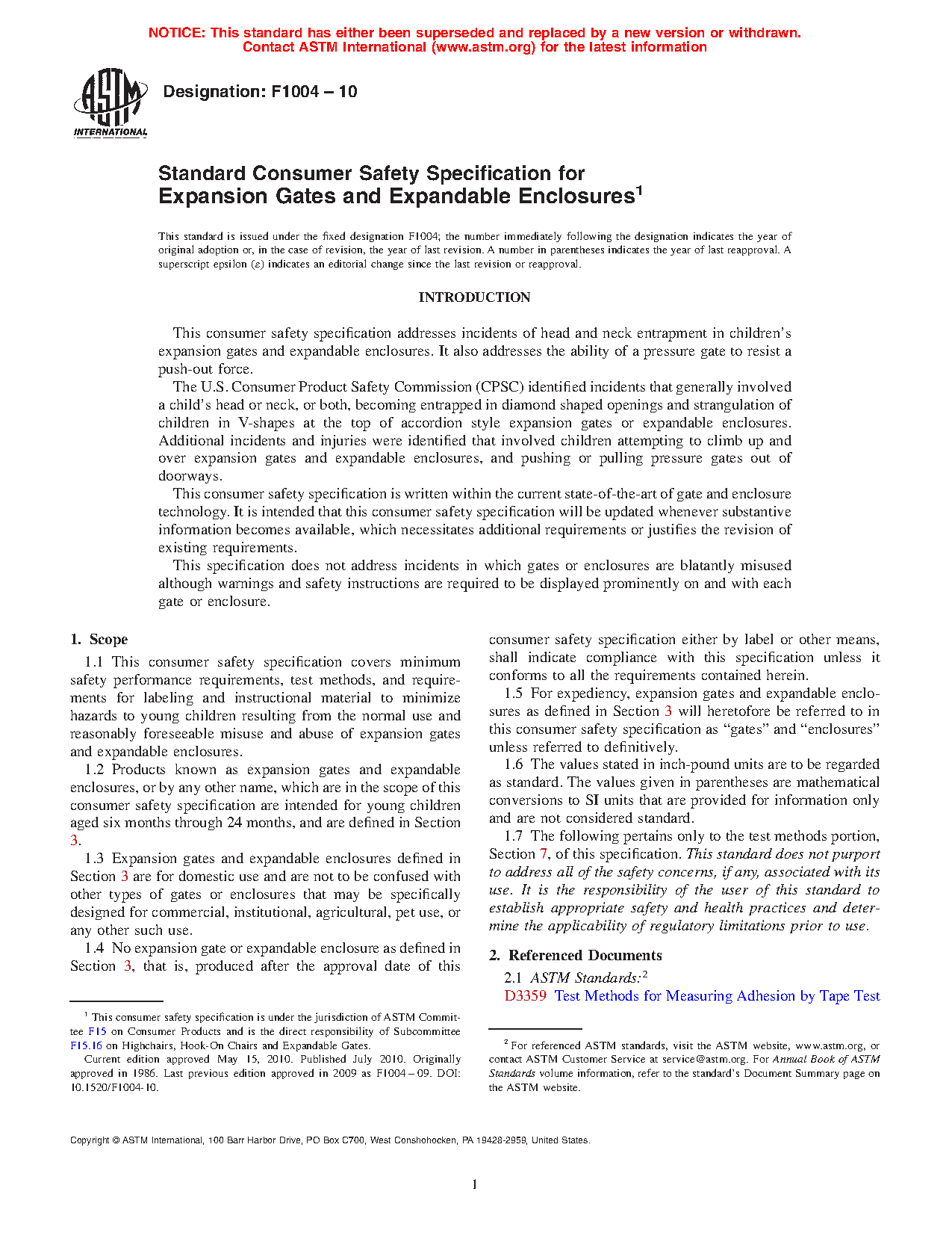 1.1 This consumer safety specification covers minimum safety performance requirements, test methods, and requirements for labeling and instructional material to minimize hazards to young children resulting from the normal use and reasonably foreseeable misuse and abuse of expansion gates and expandable enclosures.