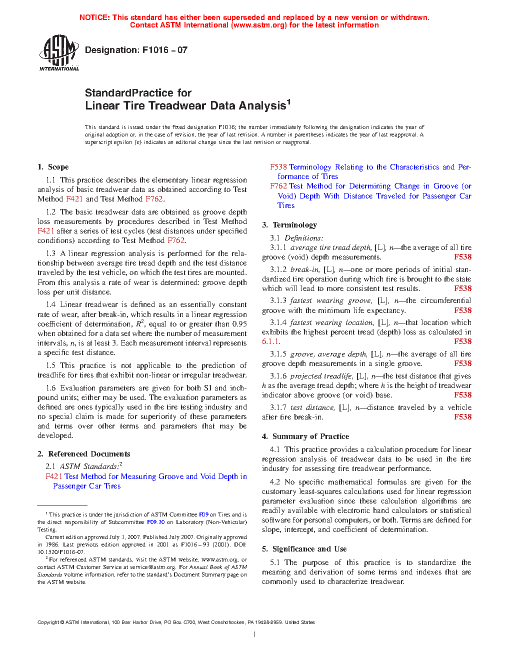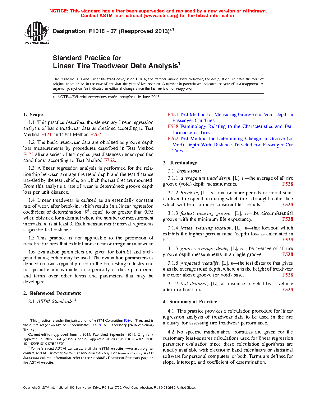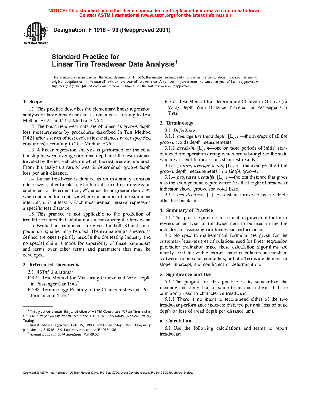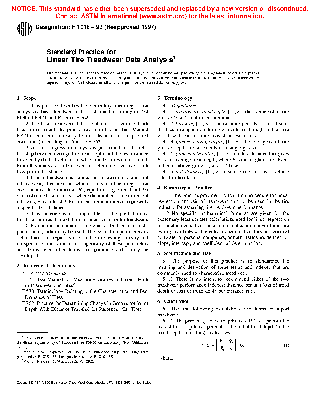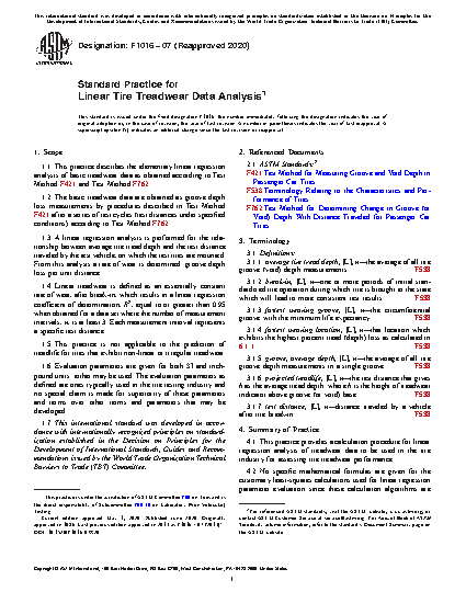 1.1 This practice describes the elementary linear regression analysis of basic treadwear data as obtained according to Test Method F421 and Test Method F762.