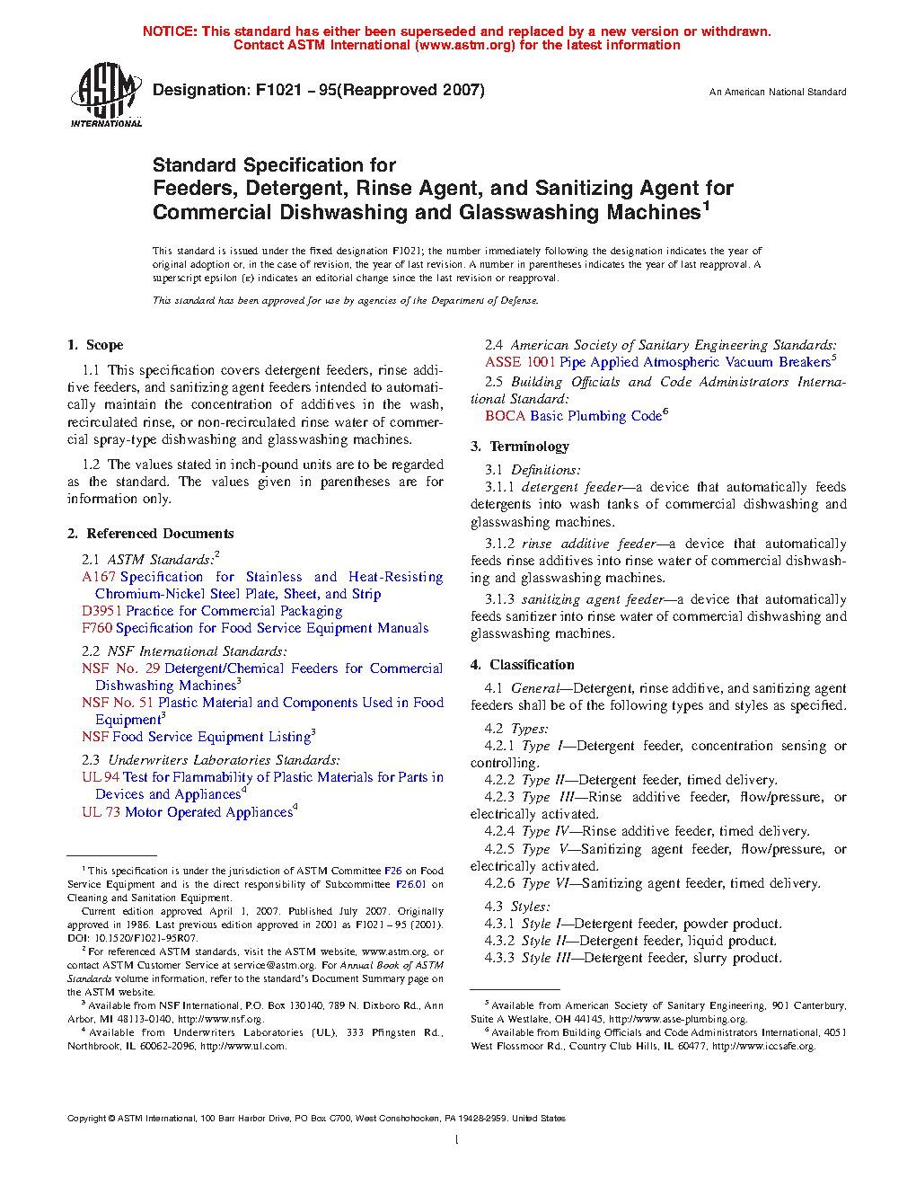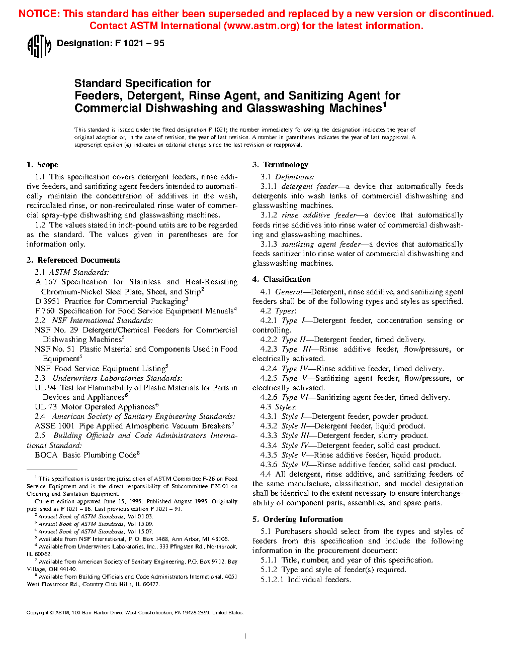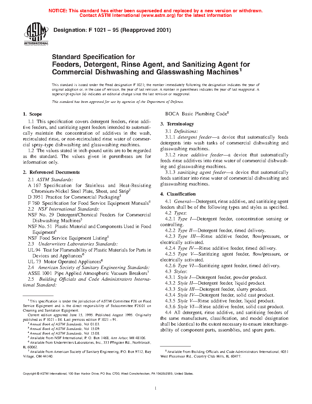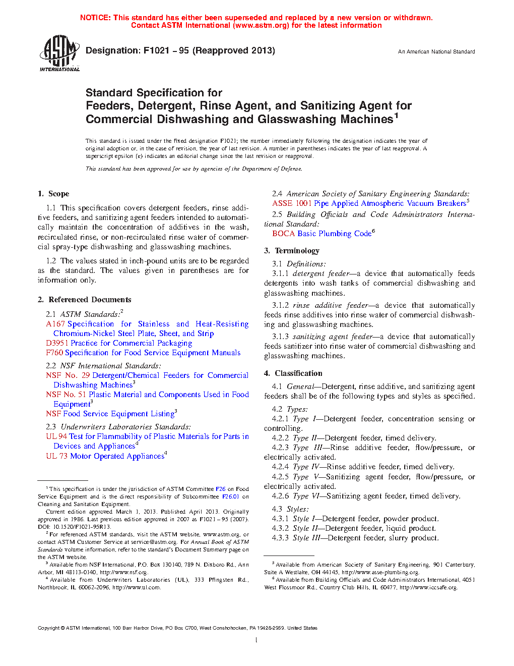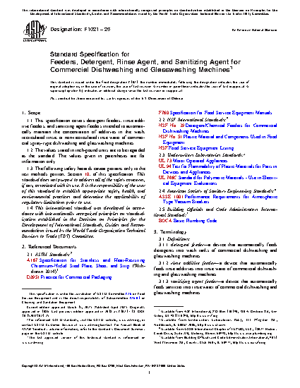 1.1 This specification covers detergent feeders, rinse additive feeders, and sanitizing agent feeders intended to automatically maintain the concentration of additives in the wash, recirculated rinse, or non-recirculated rinse water of commercial spray-type dishwashing and glasswashing machines.