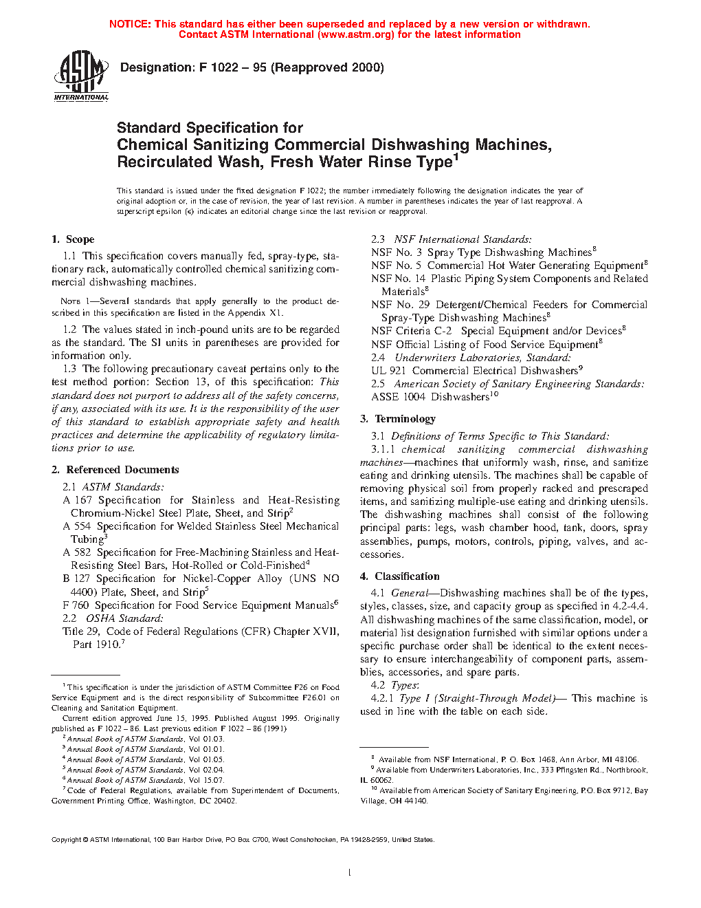 1.1 This specification covers manually fed, spray-type, stationary rack, automatically controlled chemical sanitizing commercial dishwashing machines.
