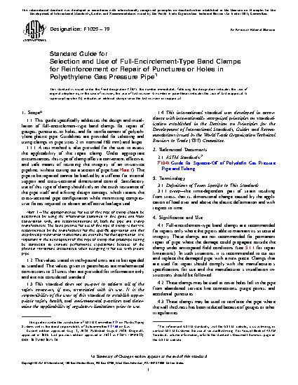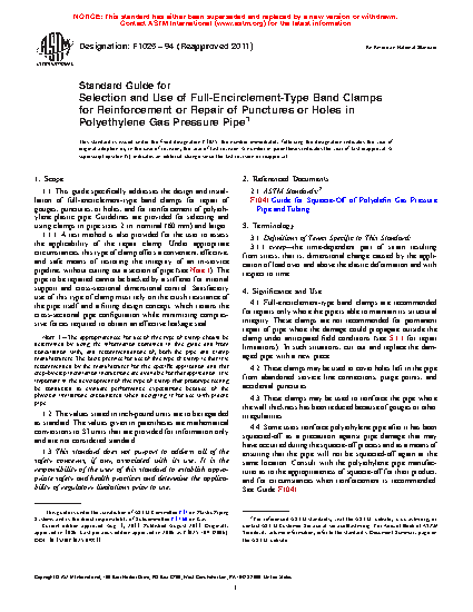 1.1 This guide specifically addresses the design and installation of full-encirclement-type band clamps for repair of gouges, punctures, or holes, and for reinforcement of polyethylene plastic pipe. Guidelines are provided for selecting and using clamps in pipe sizes 2 in. nominal (60 mm) and larger.