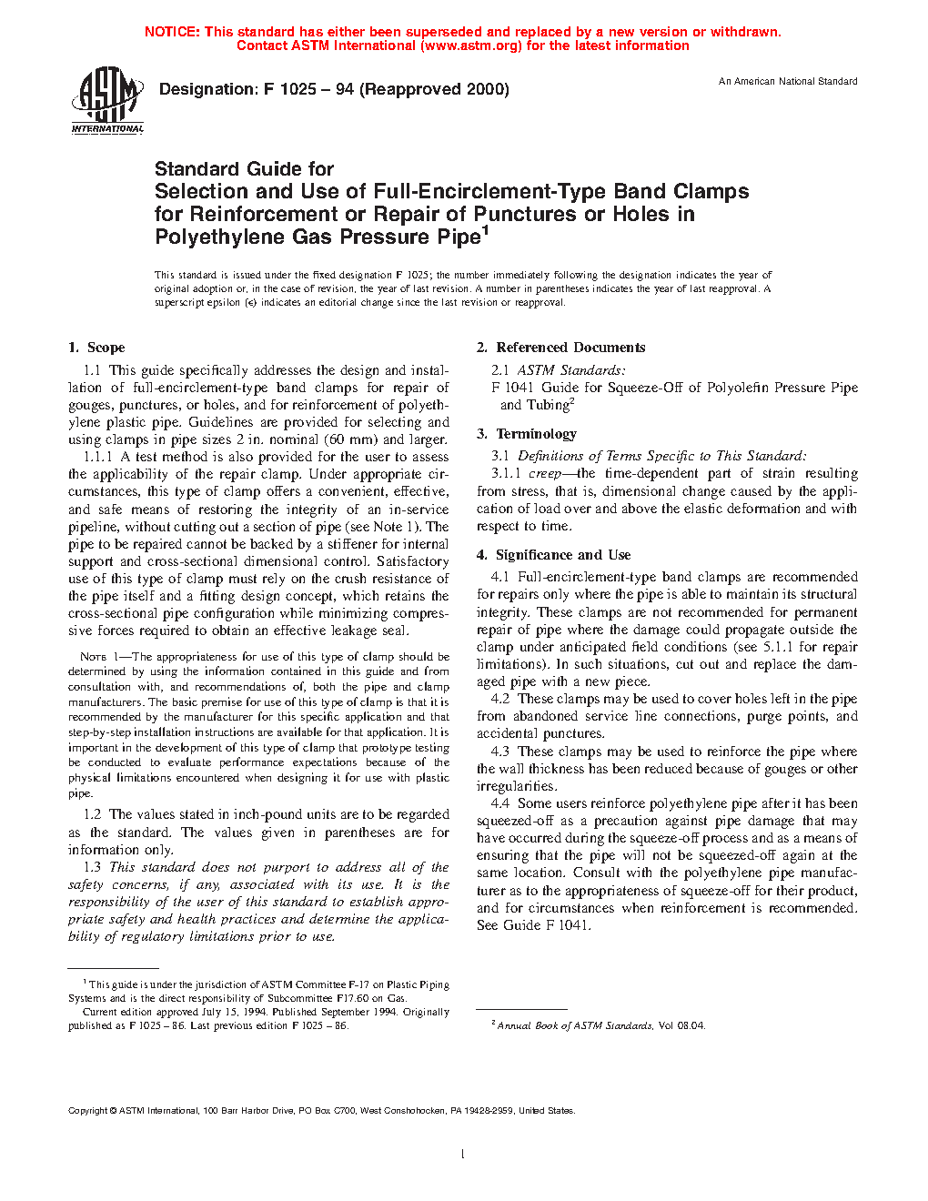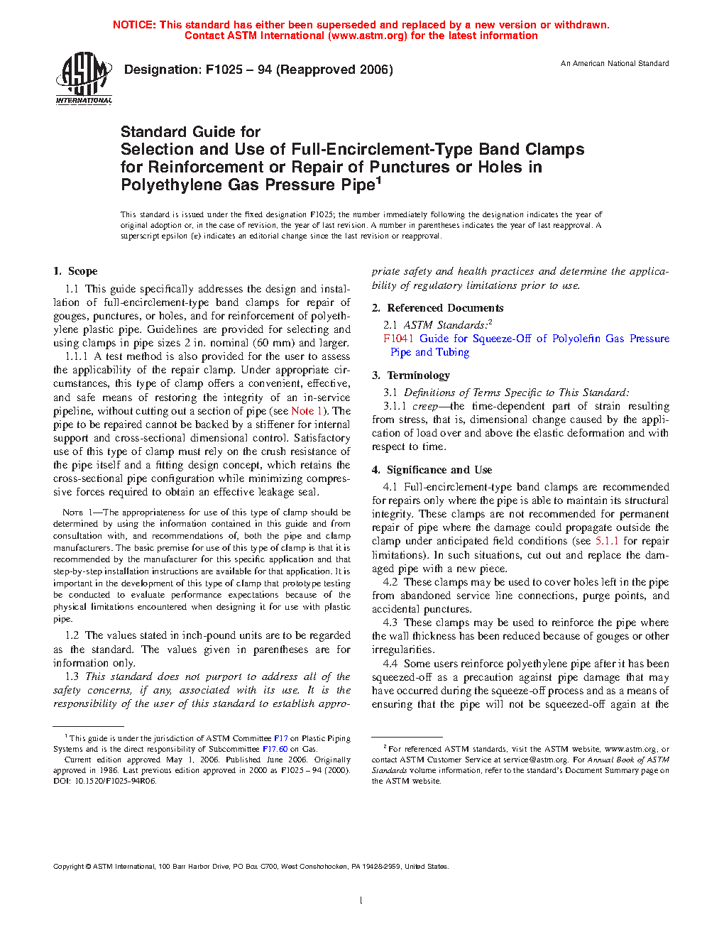 4.4 Some users reinforce polyethylene pipe after it has been squeezed-off as a precaution against pipe damage that may have occurred during the squeeze-off process and as a means of ensuring that the pipe will not be squeezed-off again at the same location. Consult with the polyethylene pipe manufacturer as to the appropriateness of squeeze-off for their product, and for circumstances when reinforcement is recommended. See Guide F1041.