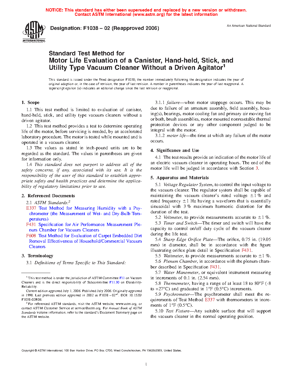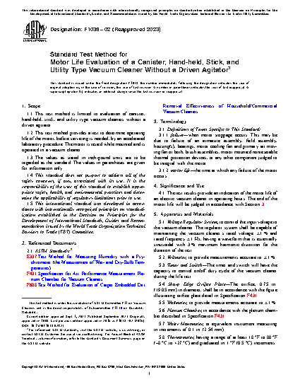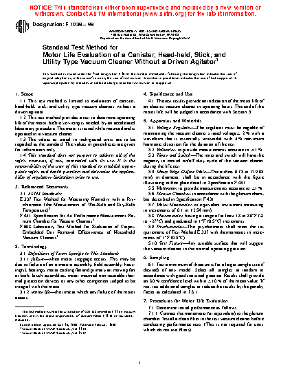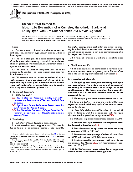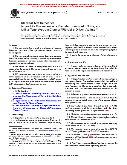 1.2 This test method provides a test to determine operating life of the motor, before servicing is needed, by an accelerated laboratory procedure. The motor is tested while mounted and is operated in a vacuum cleaner.