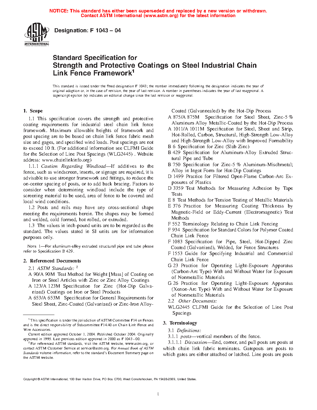 1.1 This specification covers the strength and protective coating requirements for industrial metal chain link fence framework up to 12 ft (3.66 m) maximum height with a post spacing not to exceed 10 ft (3 m).