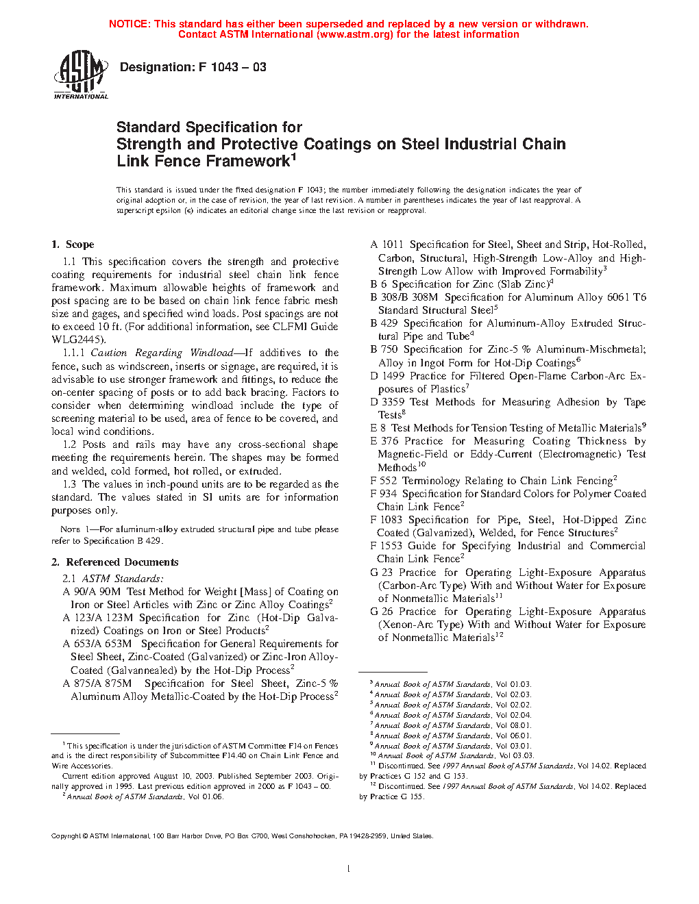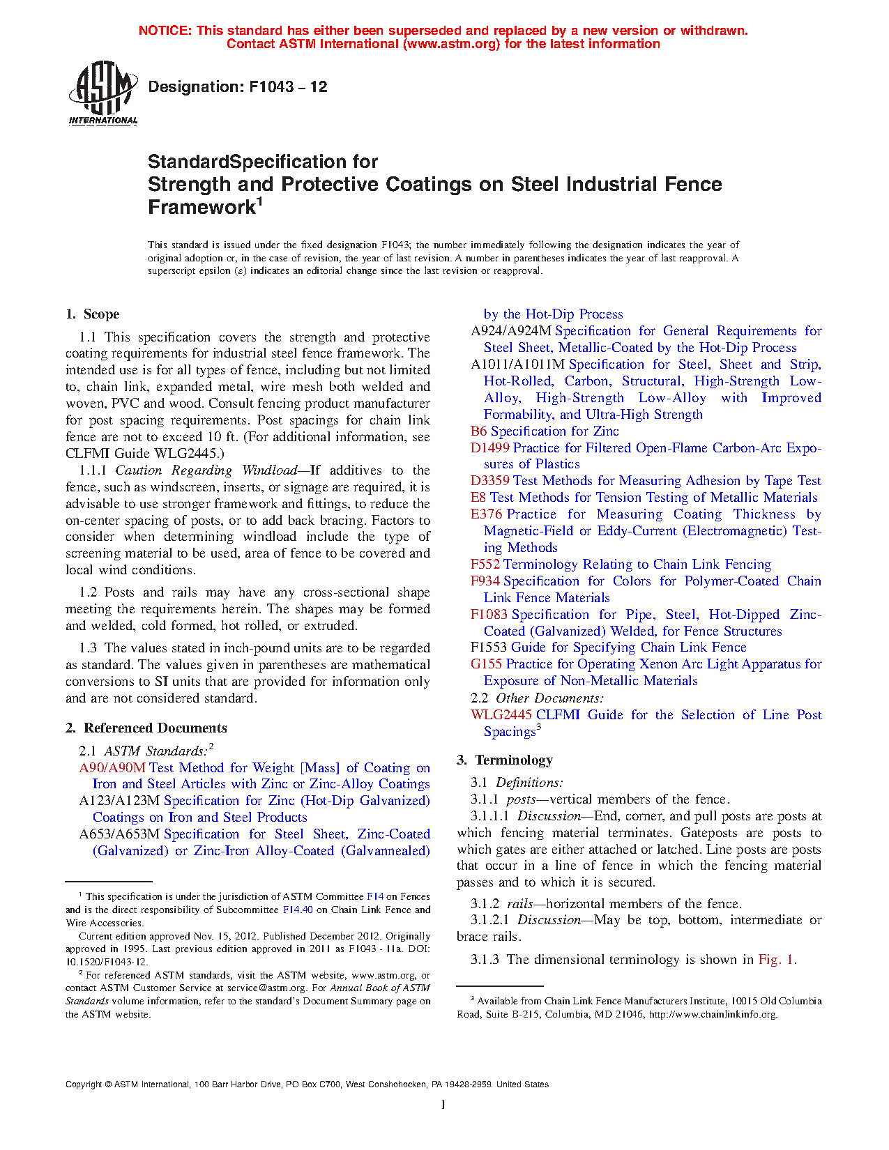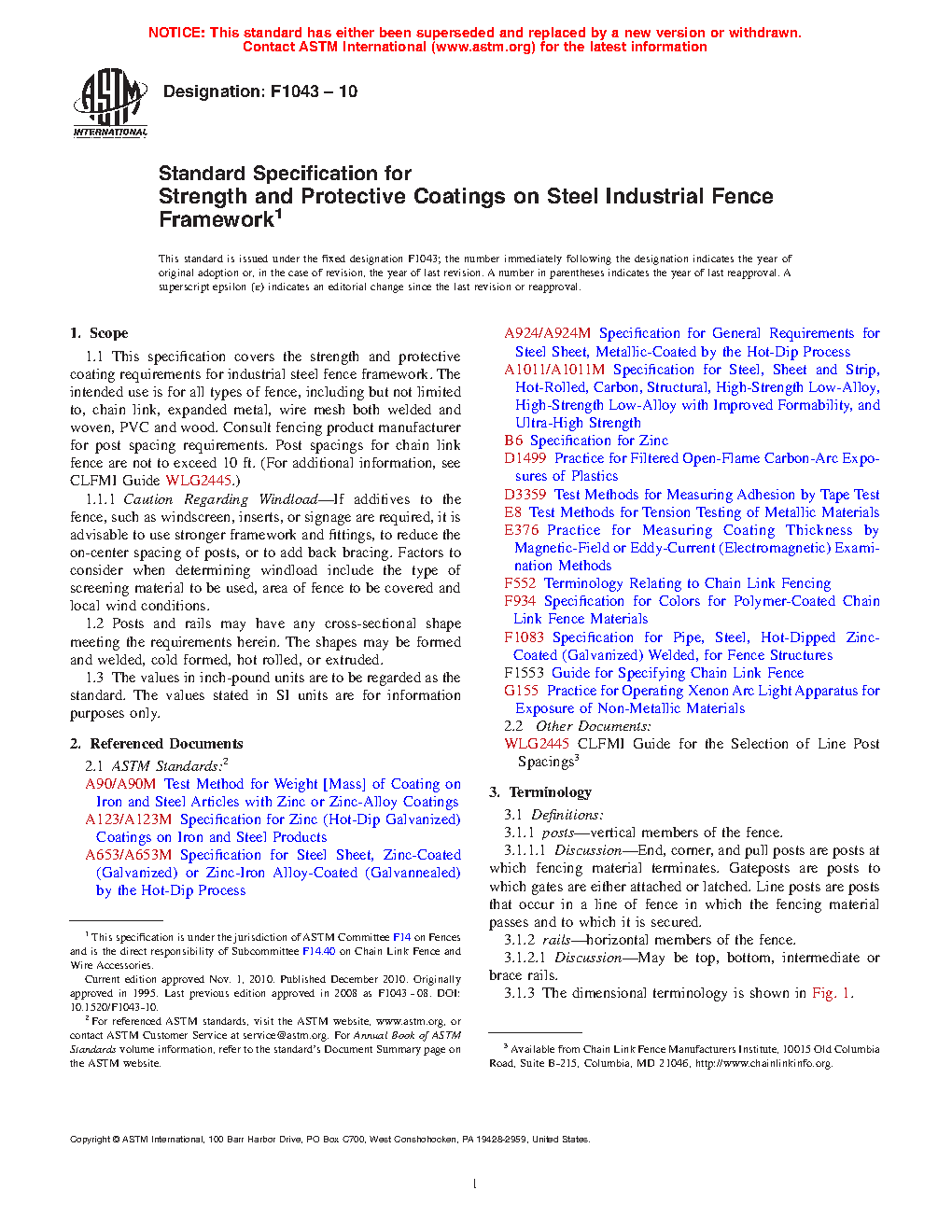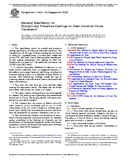 1.1 This specification covers the strength and protective coating requirements for industrial steel chain link fence framework. Maximum allowable heights of framework and post spacing are to be based on chain link fence fabric mesh size and gages, and specified wind loads. Post spacings are not to exceed 10 ft. (For additional information, see CLFMI Guide WLG2445).