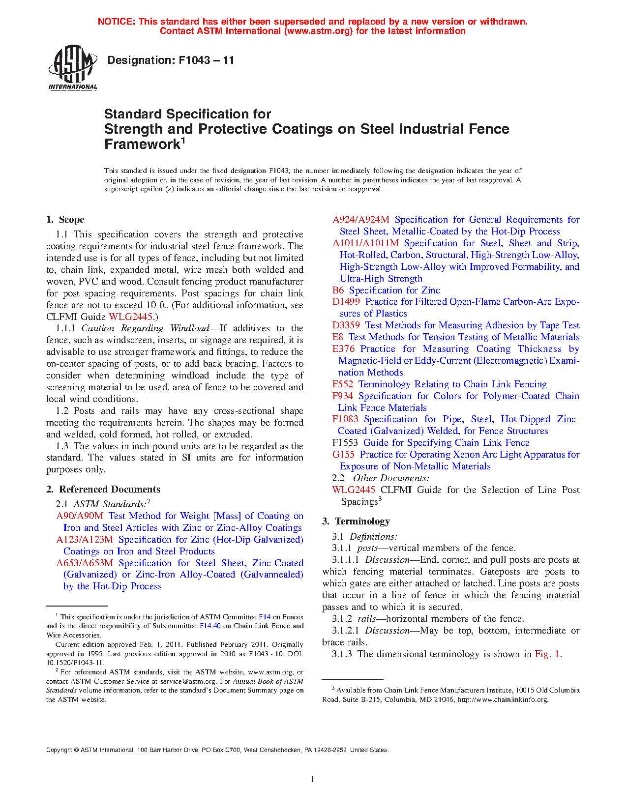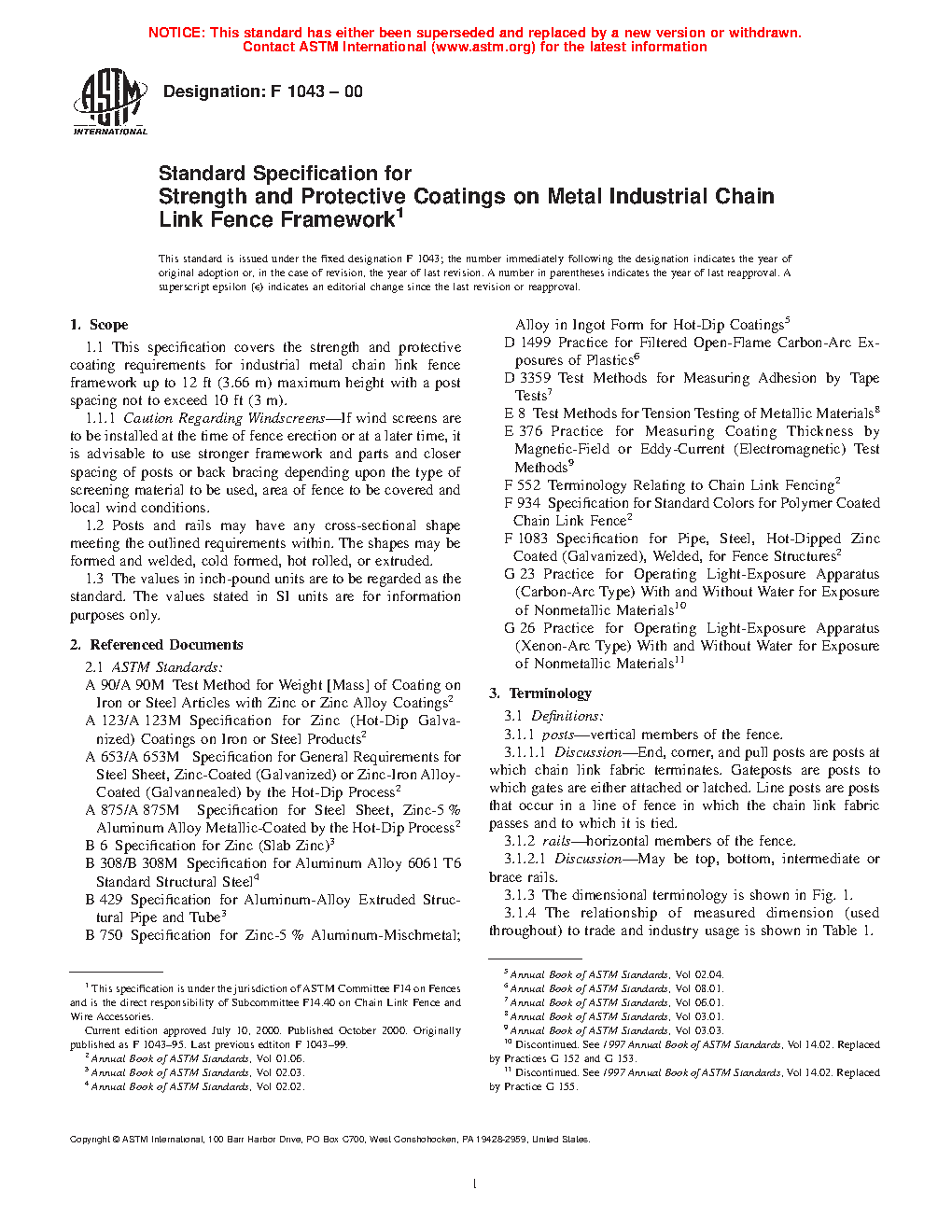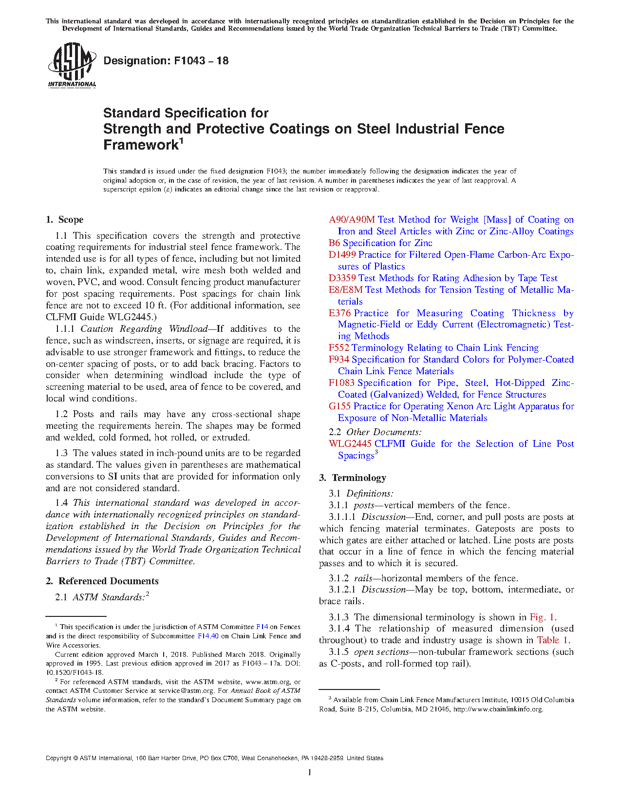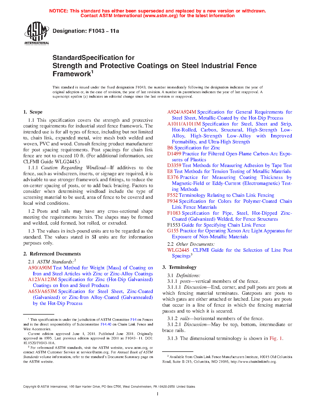 1.1 This specification covers the strength and protective coating requirements for industrial steel chain link fence framework. Maximum allowable heights of framework and post spacing are to be based on chain link fence fabric mesh size and gages, and specified wind loads. Post spacings are not to exceed 10 ft. (For additional information, see CLFMI Guide WLG2445).