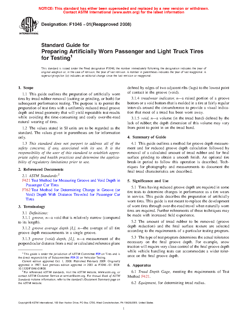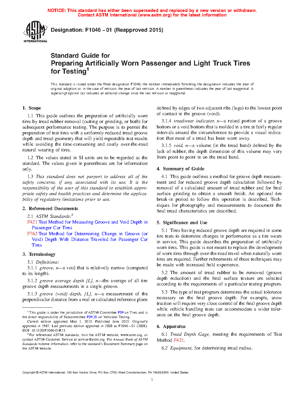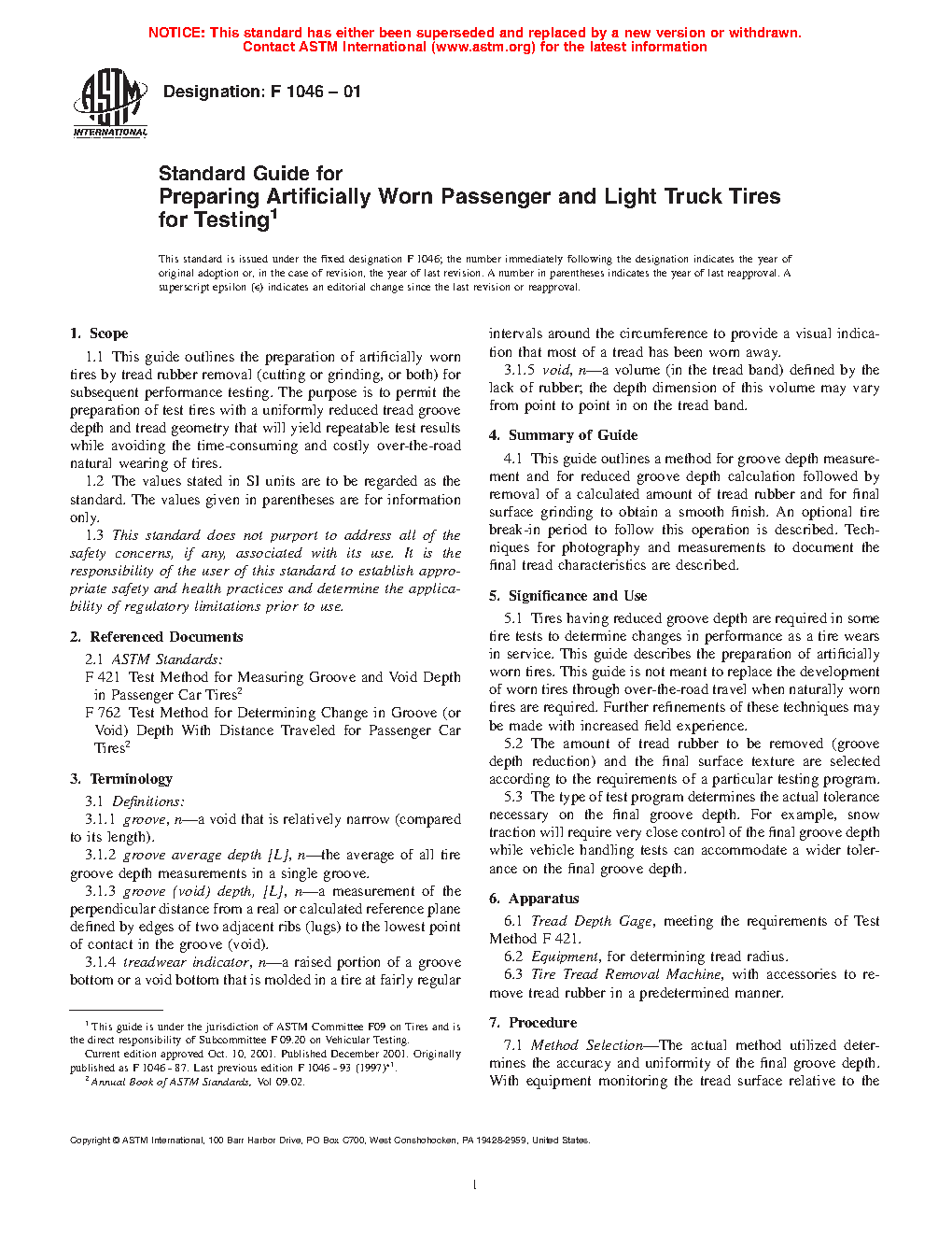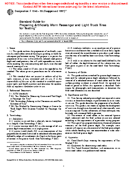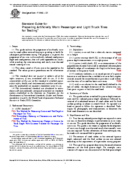 1.1 This guide outlines the preparation of artificially worn tires by tread rubber removal (cutting or grinding, or both) for subsequent performance testing. The purpose is to permit the preparation of test tires with a uniformly reduced tread groove depth and tread geometry that will yield repeatable test results while avoiding the time-consuming and costly over-the-road natural wearing of tires.