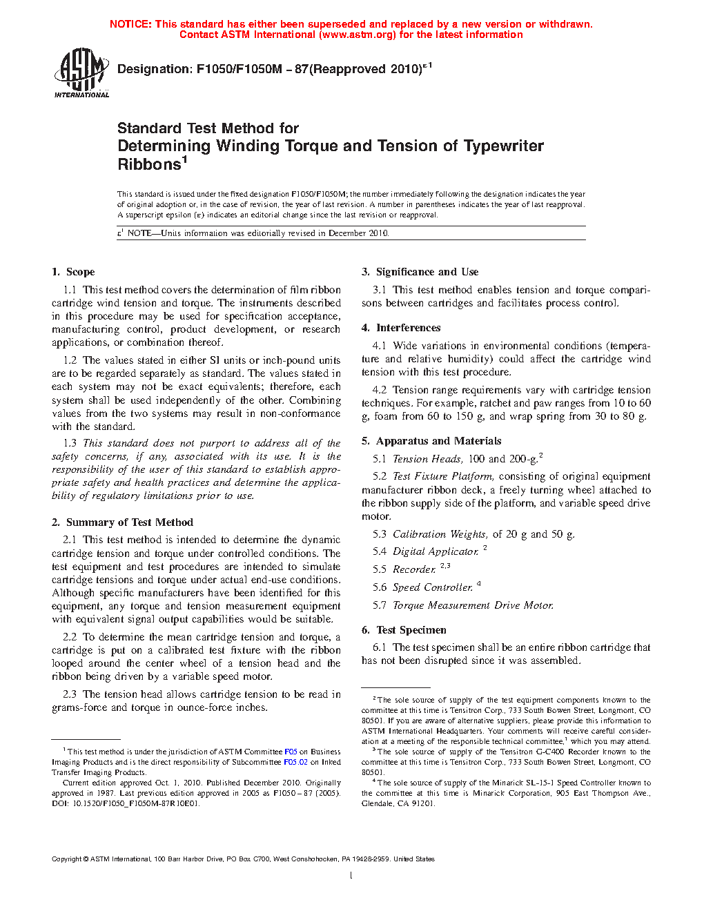 1.1 This test method covers the determination of film ribbon cartridge wind tension and torque. The instruments described in this procedure may be used for specification acceptance, manufacturing control, product development, or research applications, or combination thereof.