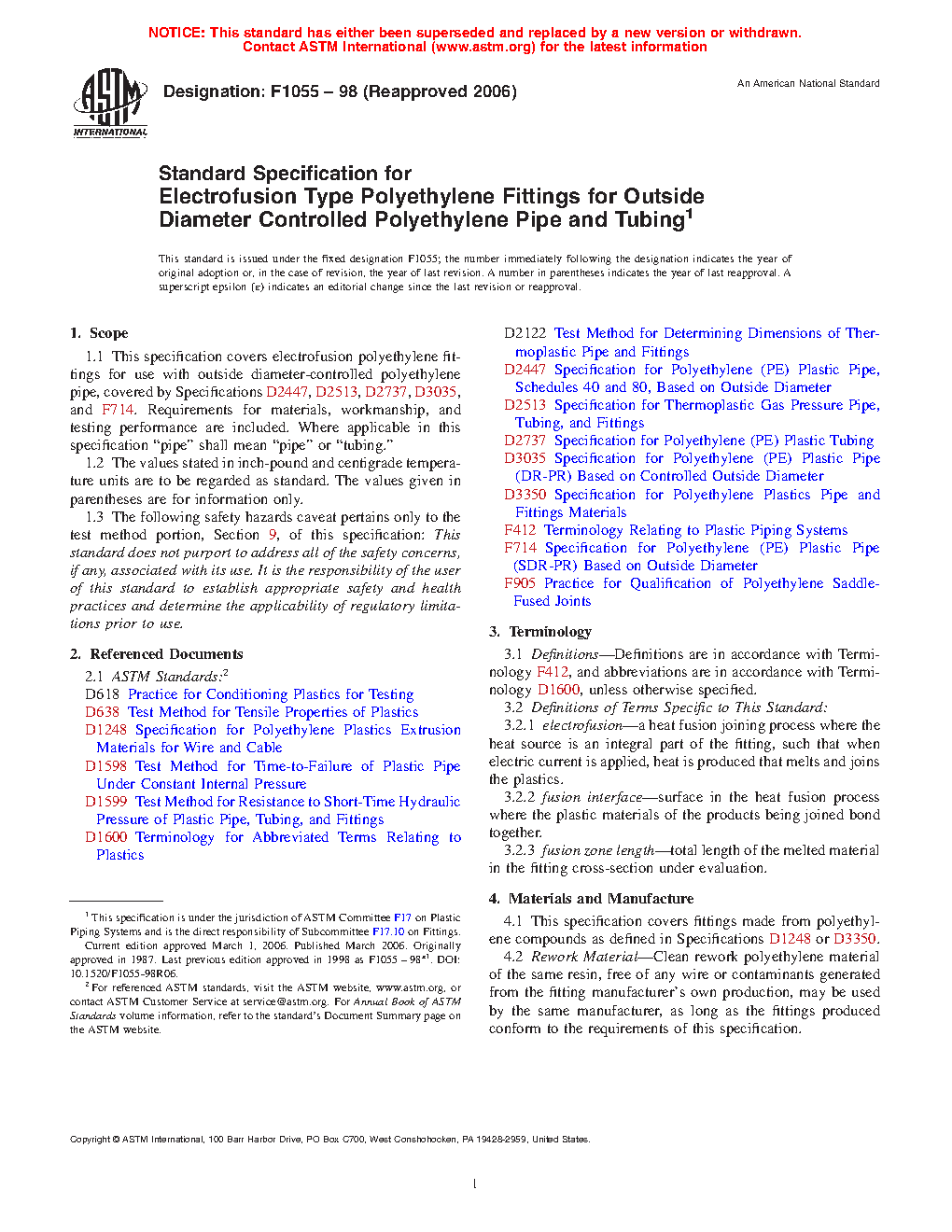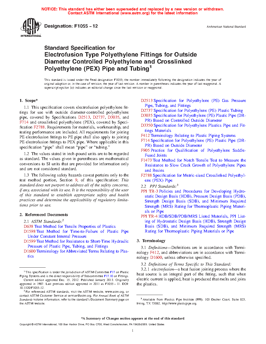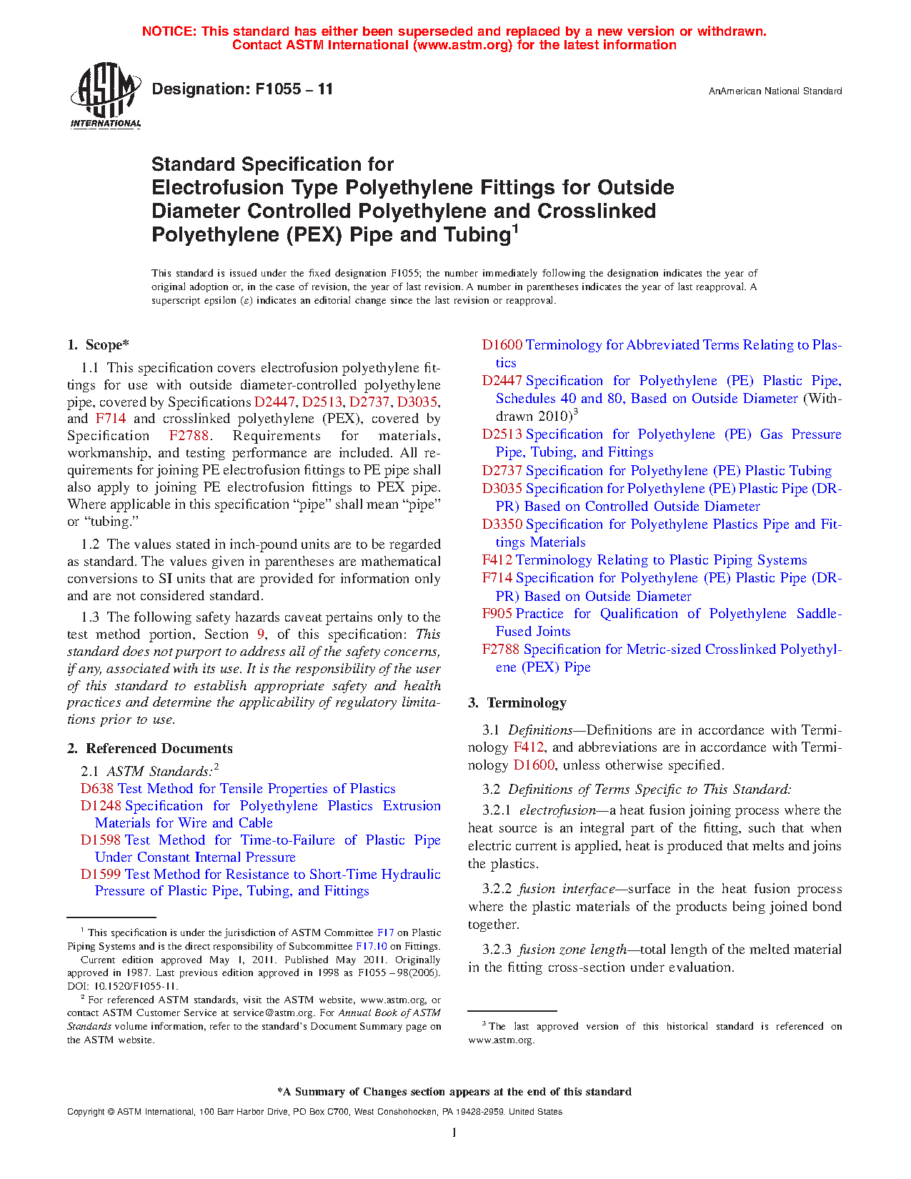 1.1 This specification covers electrofusion polyethylene fittings for use with outside diameter-controlled polyethylene pipe, covered by Specifications D2513, D2737, D3035, and F714 and crosslinked polyethylene (PEX), covered by Specifications F876 and F2788. Requirements for materials, workmanship, and testing performance are included. All requirements for joining PE electrofusion fittings to PE pipe shall also apply to joining PE electrofusion fittings to PEX pipe. Where applicable in this specification “pipe” shall mean “pipe” or “tubing.”