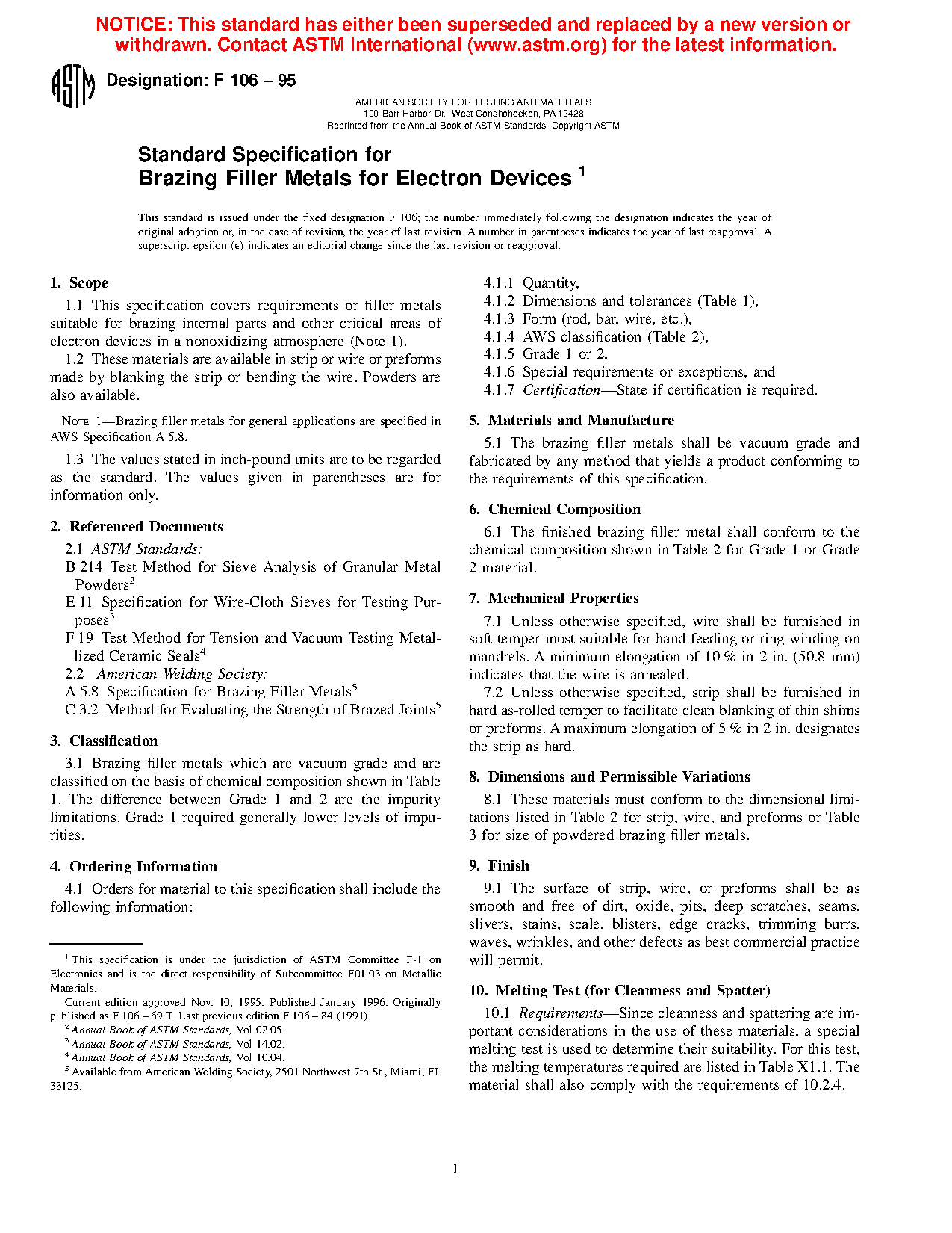1.1 This specification covers requirements or filler metals suitable for brazing internal parts and other critical areas of electron devices in a nonoxidizing atmosphere (Note 1).