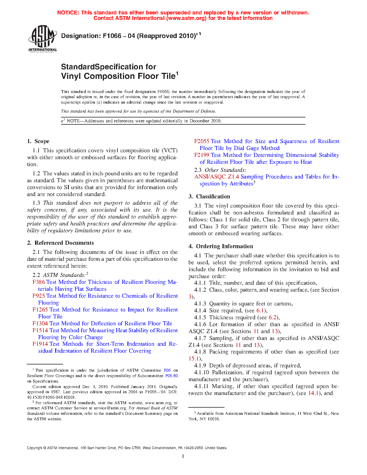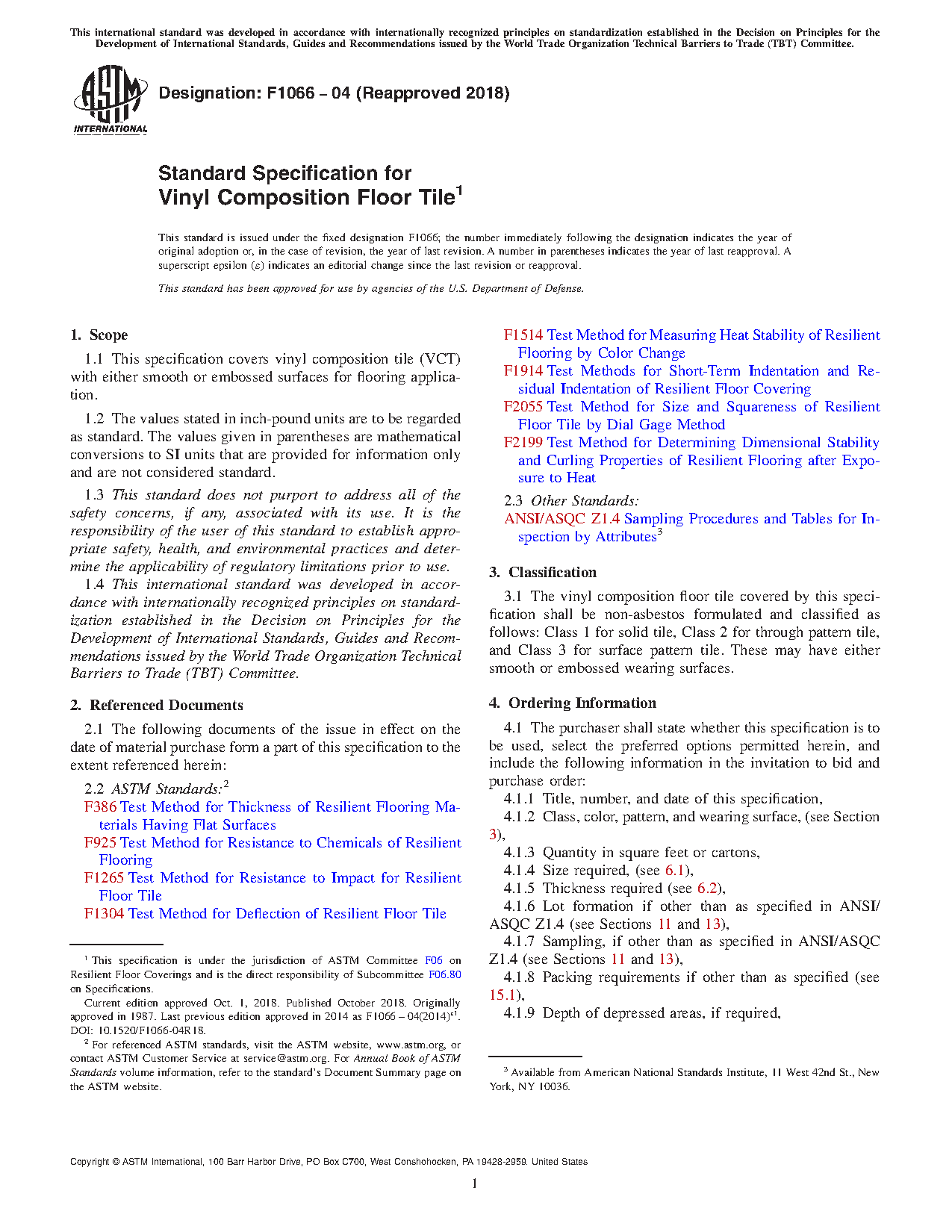 1.1 This specification covers vinyl composition tile (VCT) with either smooth or embossed surfaces for flooring application.