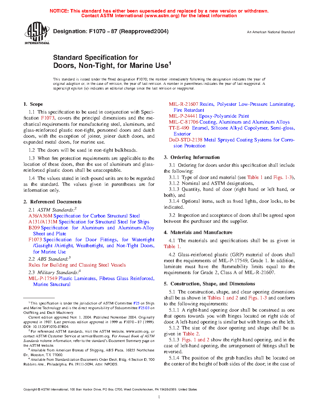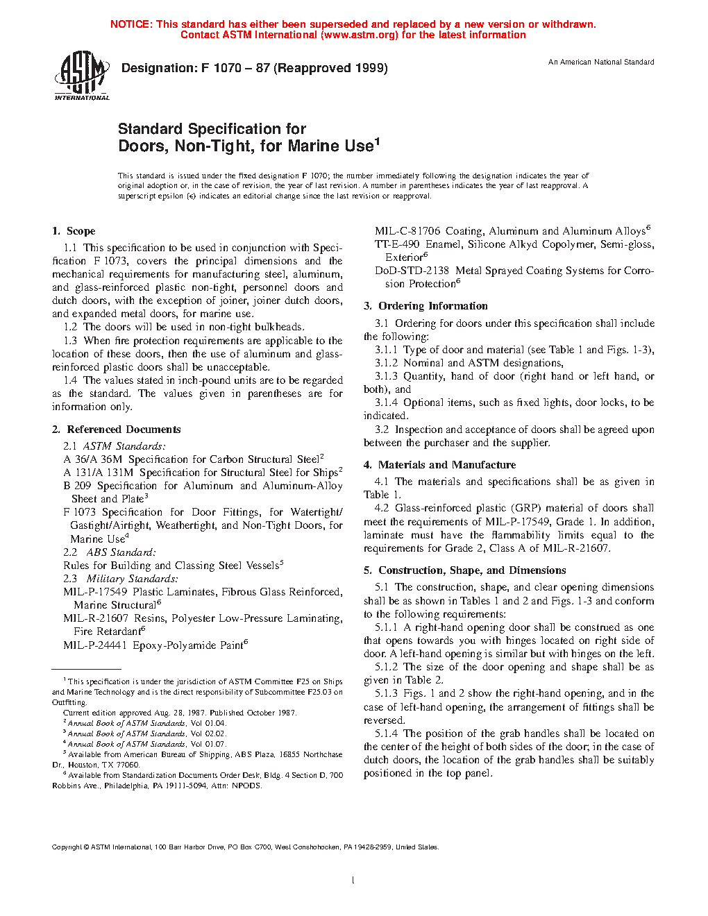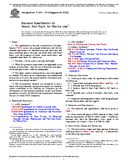 1.1 This specification to be used in conjunction with Specification F1073, covers the principal dimensions and the mechanical requirements for manufacturing steel, aluminum, and glass-reinforced plastic non-tight, personnel doors and dutch doors, with the exception of joiner, joiner dutch doors, and expanded metal doors, for marine use.