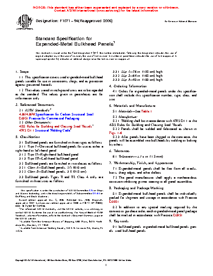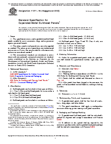 1.1 This specification covers steel expanded-metal bulkhead panels suitable for use in storerooms, shops, and as protection against personnel hazards.
