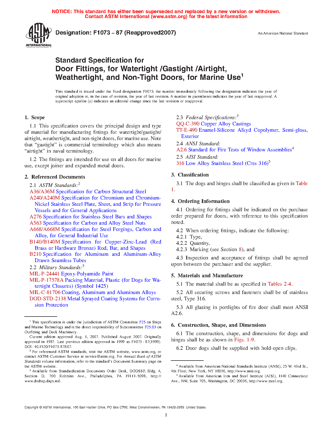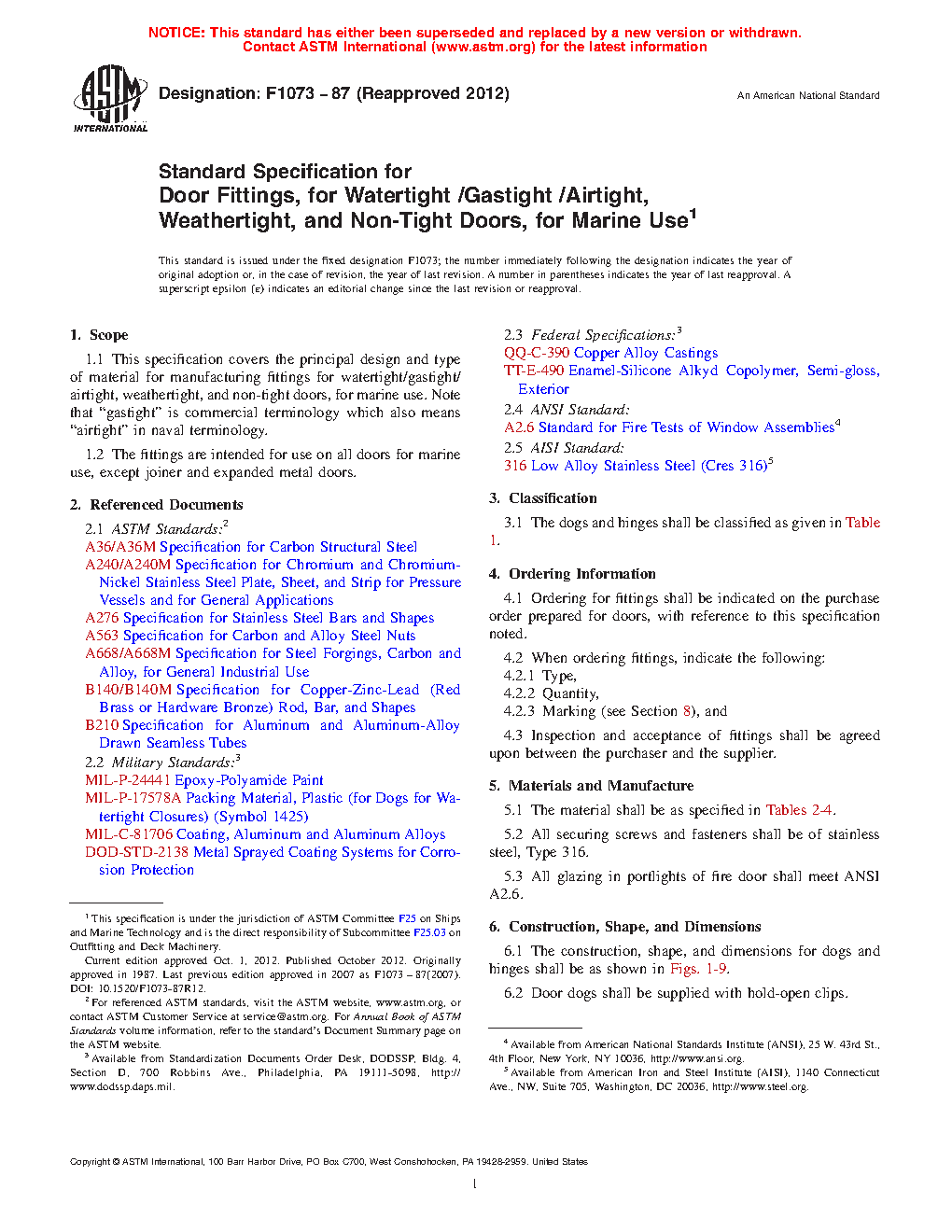 1.1 This specification covers the principal design and type of material for manufacturing fittings for watertight/gastight/airtight, weathertight, and non-tight doors, for marine use. It should be noted that "gastight" is commercial terminology which also means "airtight" in naval terminology.