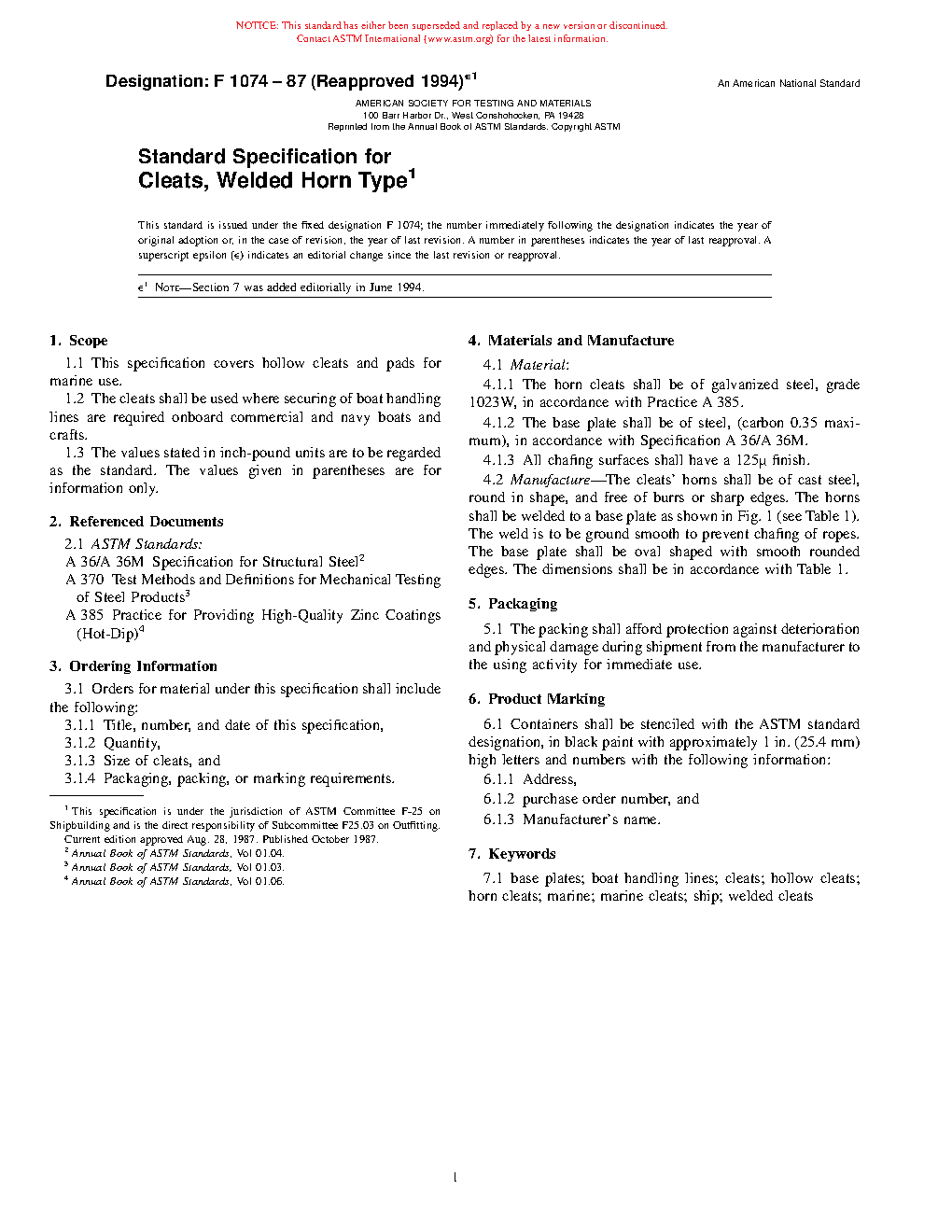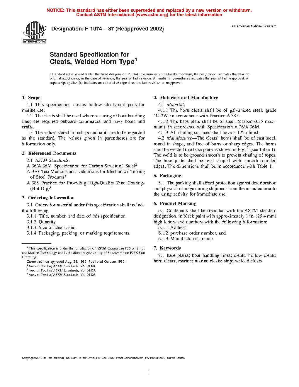This specification covers hollow welded horn type cleats and pads for marine use. The cleats shall be used where securing of boat handling lines are required onboard commercial and navy boats and crafts. The horn cleats shall be of galvanized steel, grade 1023W; the base plate shall be of the prescribed steel composition; and all chafing surfaces shall have the specified finish. The cleats� horns shall be of cast steel, round in shape, and free of burrs or sharp edges. The requirements for welding of horns to a base plate are illustrated. The dimensional requirements for cleat, rope circumference, and roper diameter are specified. Requirements for packaging and product marking are given as well.