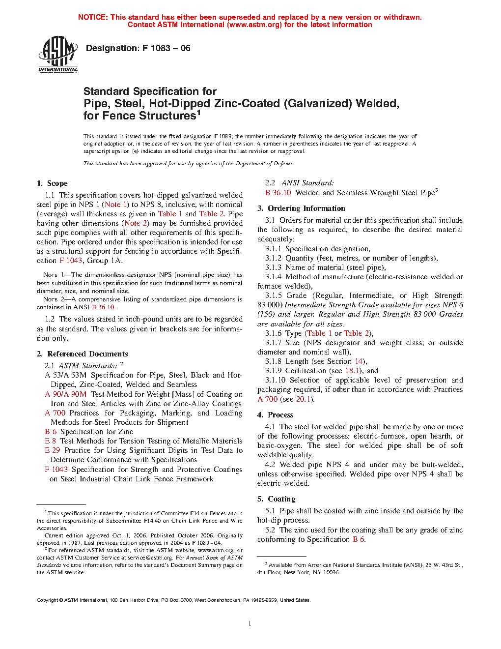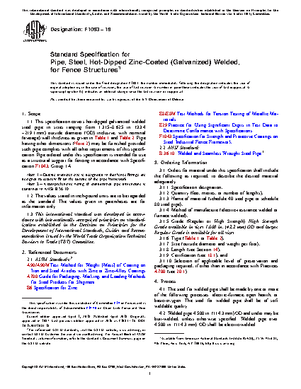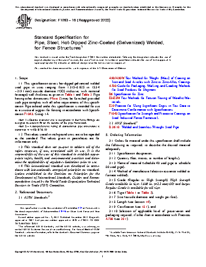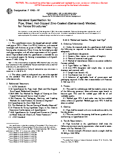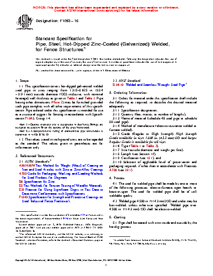 1.1 This specification covers hot-dipped galvanized welded steel pipe in sizes ranging from 1.315–8.625 in. (33.4 – 219.1 mm) outside diameter (OD) inclusive, with nominal (average) wall thickness as given in Table 1 and Table 2. Pipe having other dimensions (Note 2) may be furnished provided such pipe complies with all other requirements of this specification. Pipe ordered under this specification is intended for use as a structural support for fencing in accordance with Specification F1043, Group 1A.