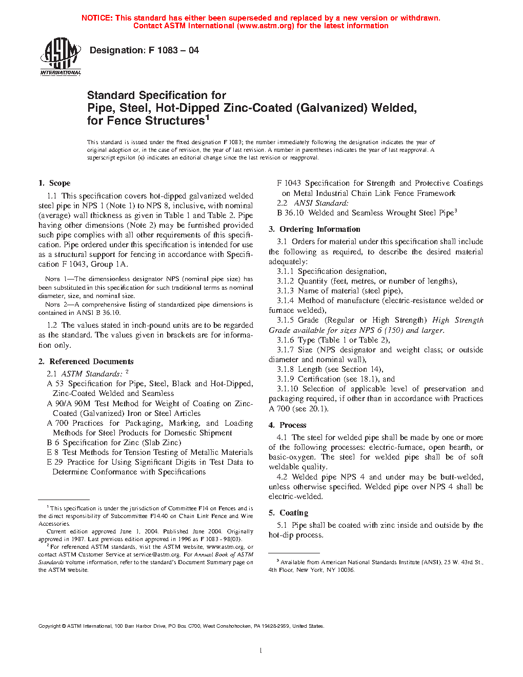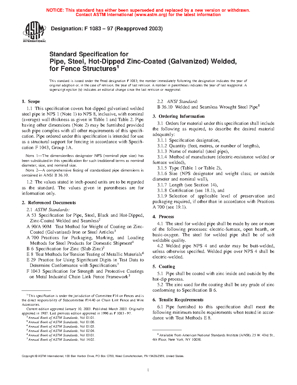 This specification covers hot-dipped zinc-coated (galvanized) welded steel pipe in NPS 1, NPS 1 �, NPS 1 �, NPS 2, NPS 2 �, NPS 3, NPS3 �, NPS 4, NPS 5, NPS 6, NPS 7, and NPS 8, with the specified nominal wall thickness, intended for fence structures such as structural support. Pipe having other dimensions may be furnished provided such pipe complies with all other requirements of this specification. The steel for welded pipe shall be be of soft weldable quality and shall be made by one or more of the following processes: electric-furnace, open hearth, or basic oxygen. Welded pipe NPS 4 and under may be butt-welded. Welded pipe over NPS 4 shall be electric welded. Pipe shall be coated with zinc inside and outside by hot-dip process. The steel pipe shall meet the tensile requirements for tensile strength and yield strength specified for regular, intermediate strength, and high strength grades. The weight of zinc coating shall be determined by strip test. The dimensional (diameter and thickness) and weight requirements for the steel pipe are specified and the test requirements for welded pipes are detailed. Lengths of toprail may be of random lengths, unless otherwise specified.