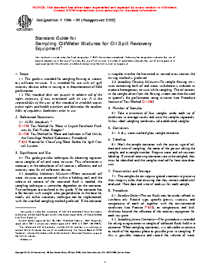 1.1 This guide is intended for sampling flowing or stationary oil/water mixtures. It is intended for use with oil spill recovery devices either in testing or in documentation of field performance.