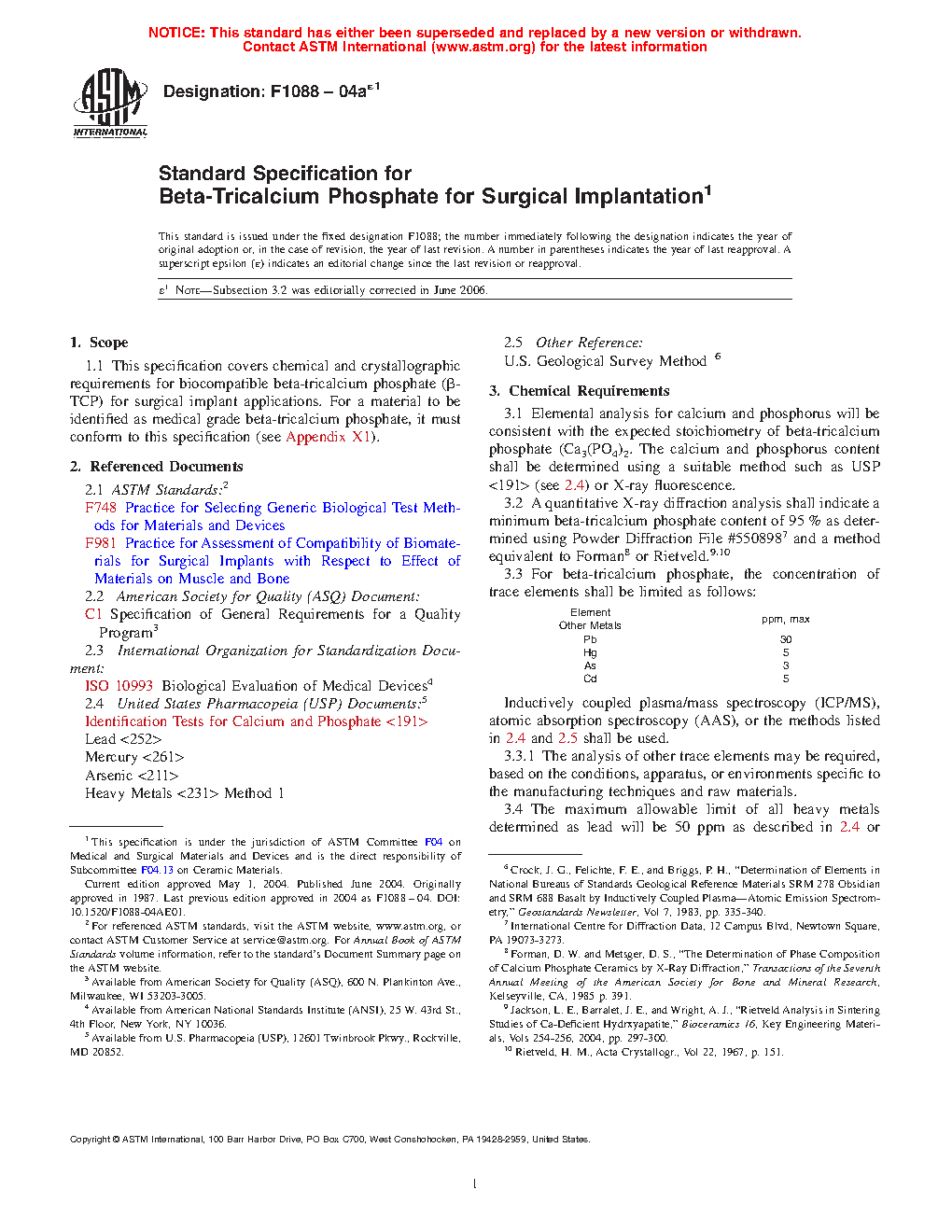 1.1 This specification covers chemical and crystallographic requirements for beta-tricalcium phosphate (β-TCP) for surgical implant applications. For a material to be identified as medical-grade beta-tricalcium phosphate, it must conform to this specification (see Appendix X1).