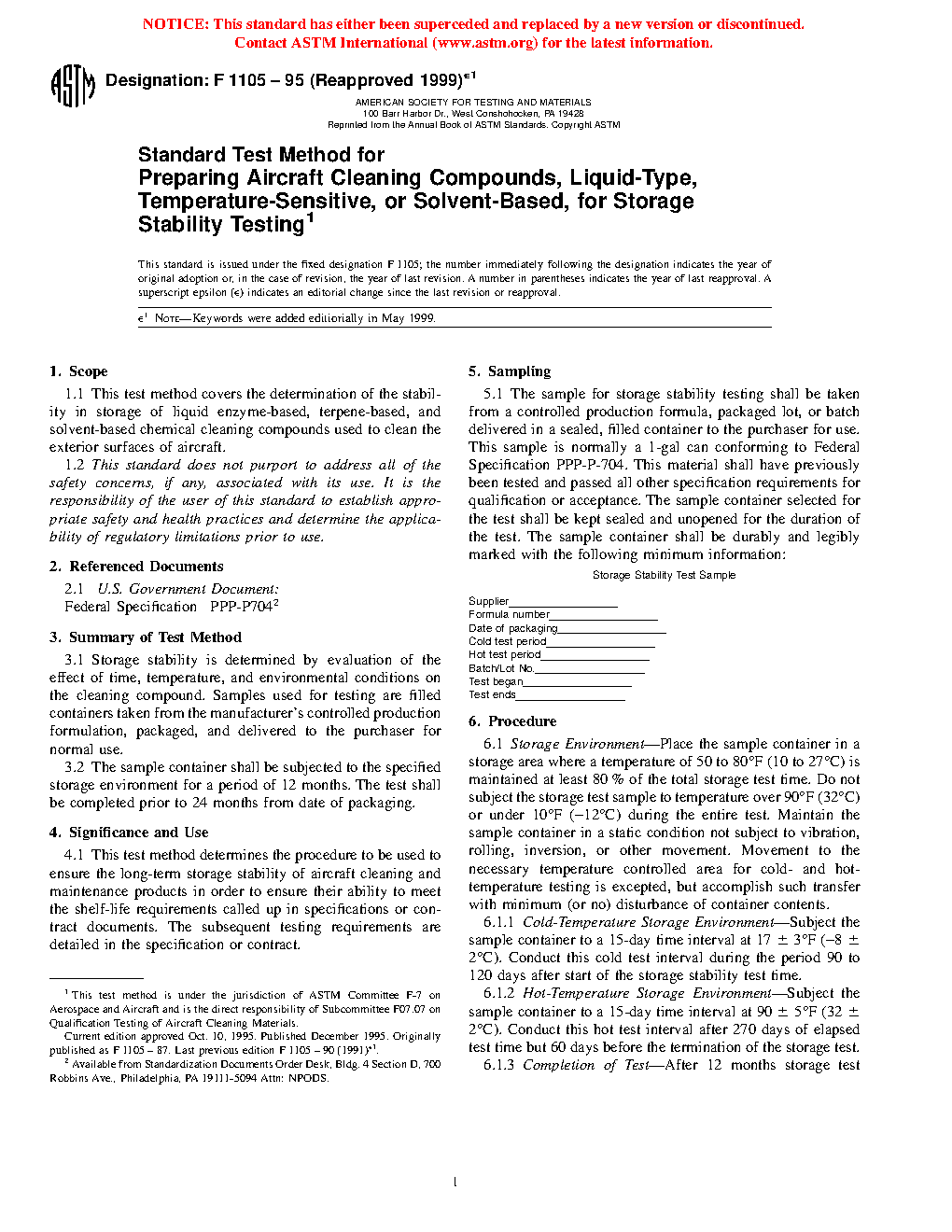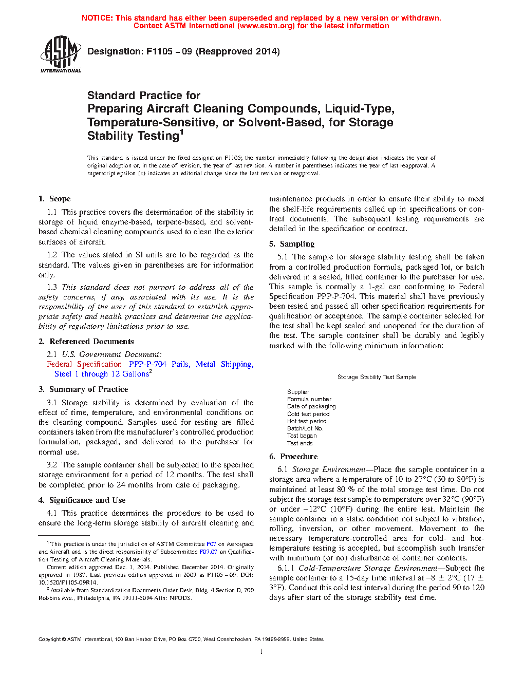 This test method determines the procedure to be used to ensure the long-term storage stability of aircraft cleaning and maintenance products in order to ensure their ability to meet the shelf-life requirements called up in specifications or contract documents. The subsequent testing requirements are detailed in the specification or contract.