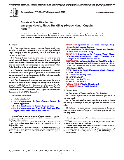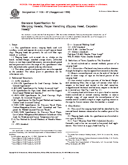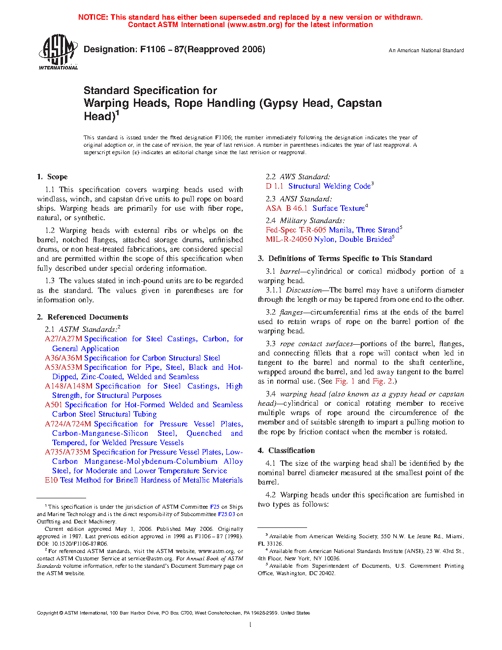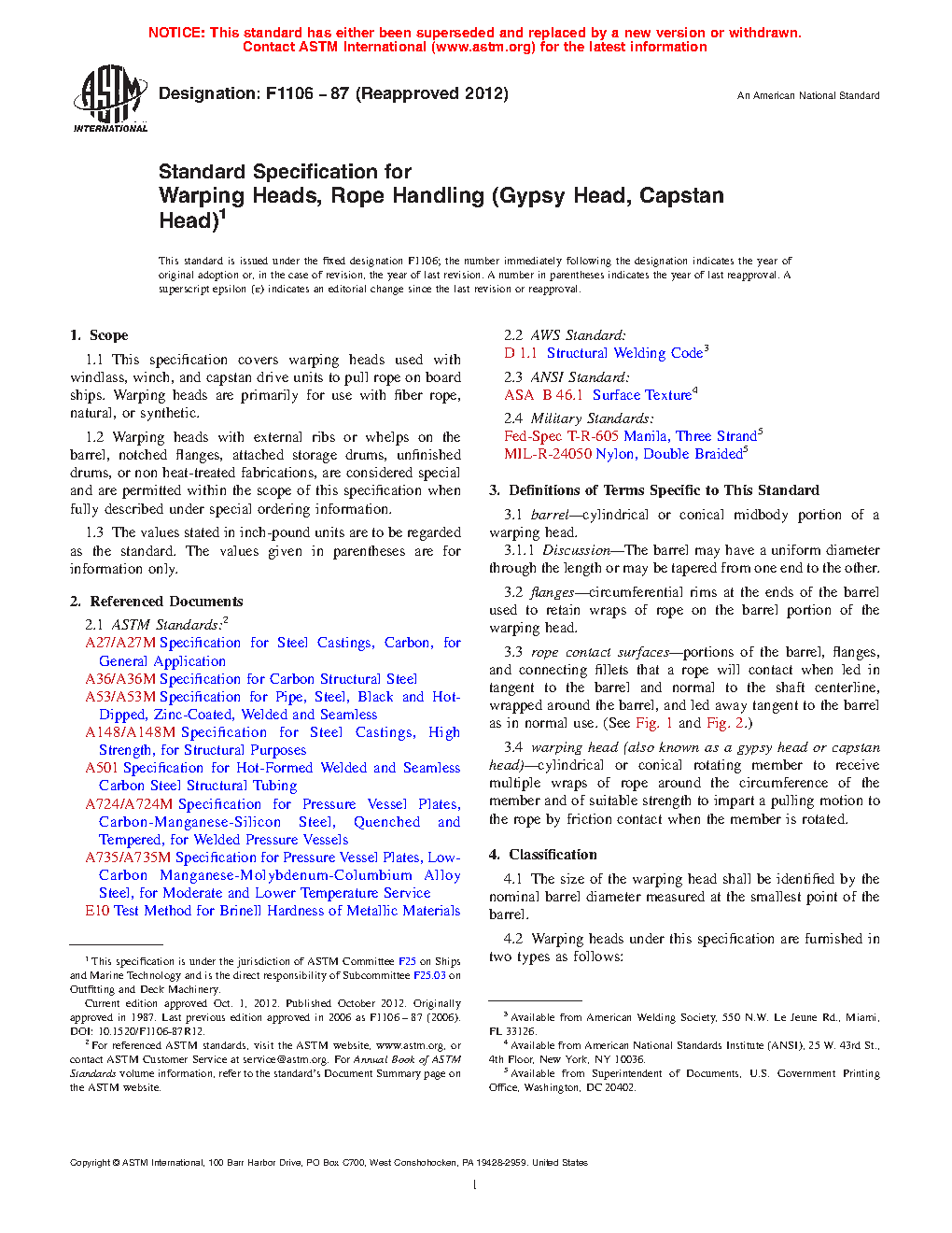 1.1 This specification covers warping heads used with windlass, winch, and capstan drive units to pull rope on board ships. Warping heads are primarily for use with fiber rope, natural, or synthetic.