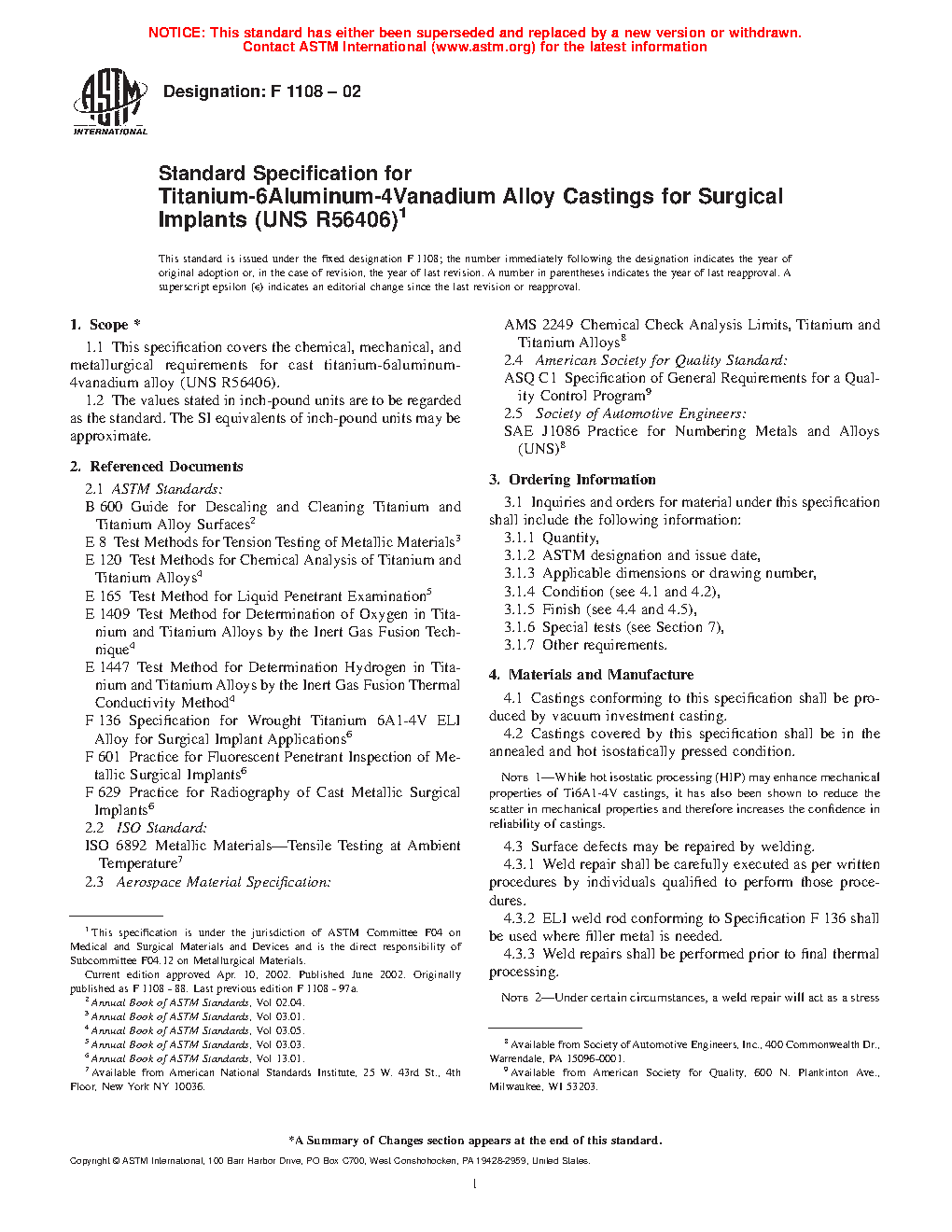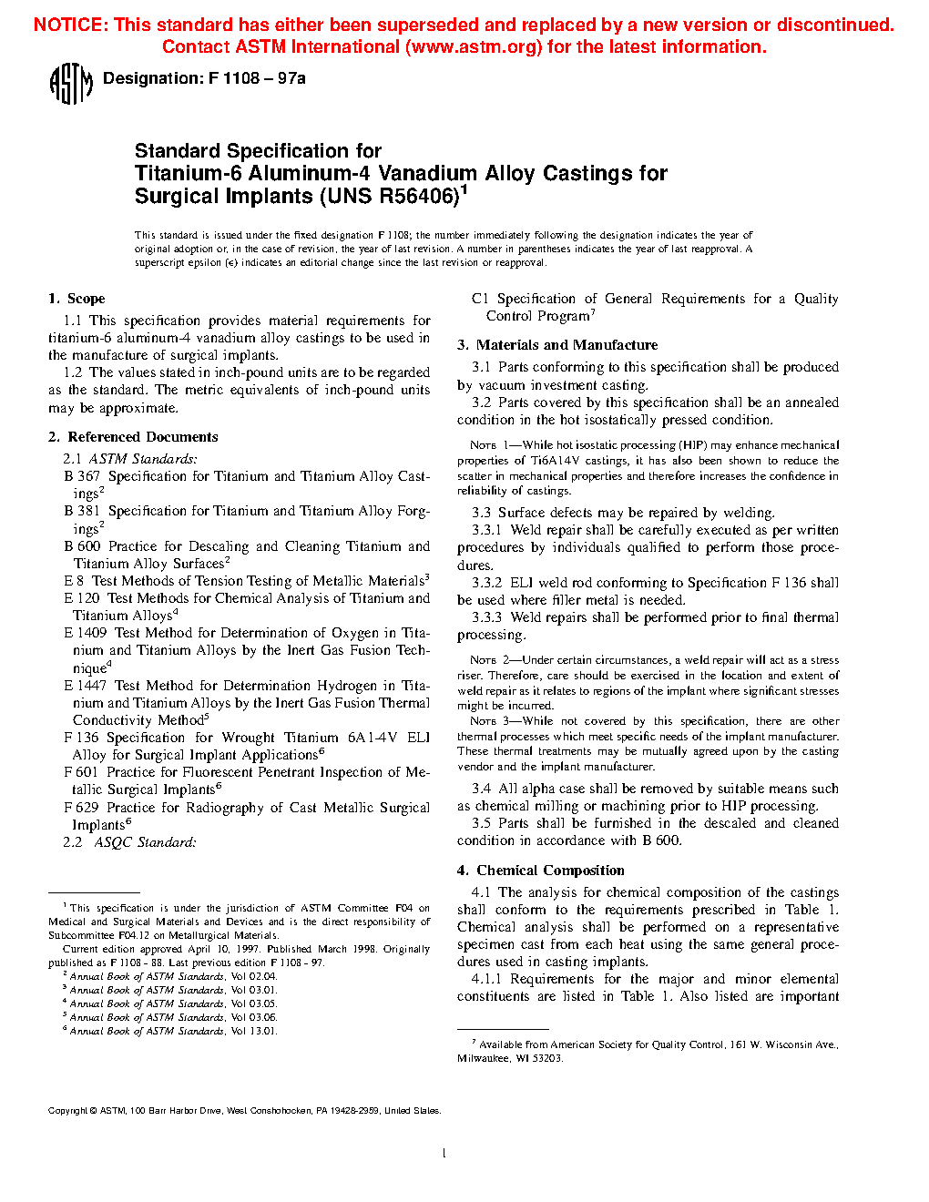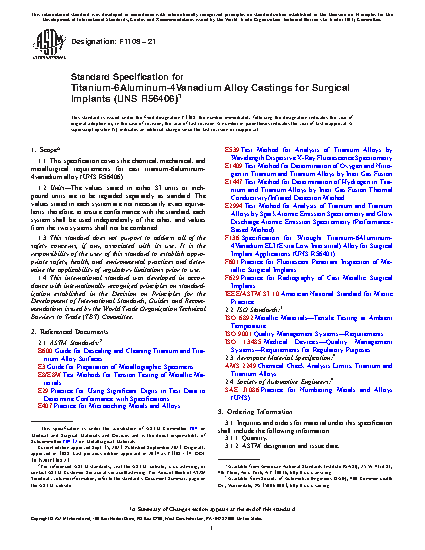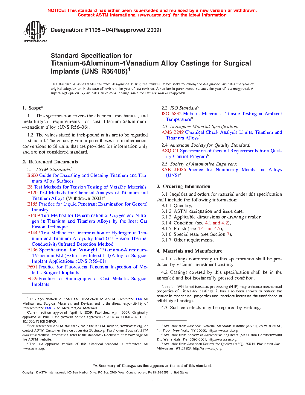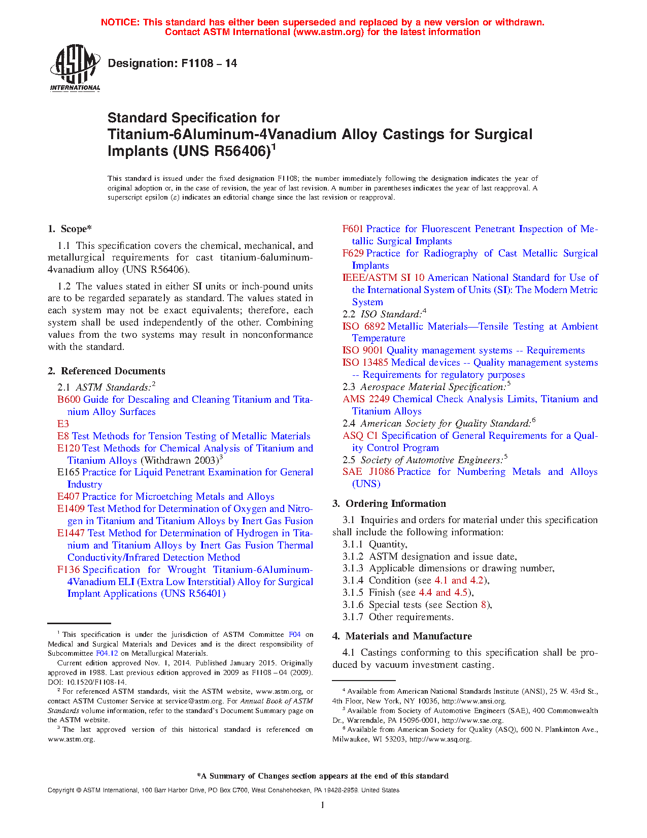 1.1 This specification covers the chemical, mechanical, and metallurgical requirements for cast titanium-6aluminum-4vanadium alloy (UNS R56406).