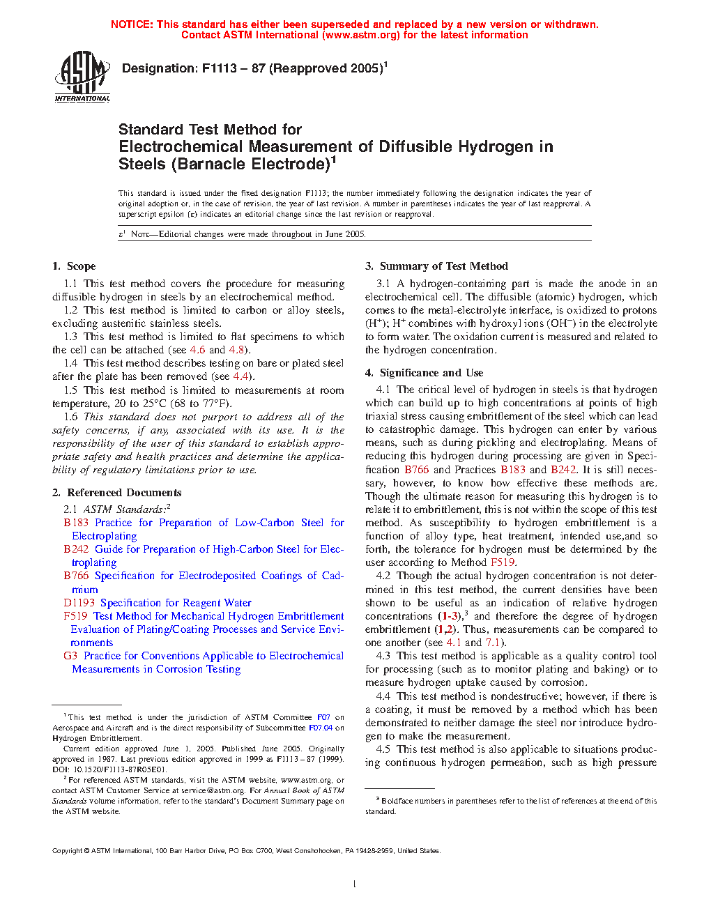 1.1 This test method covers the procedure for measuring diffusible hydrogen in steels by an electrochemical method.
