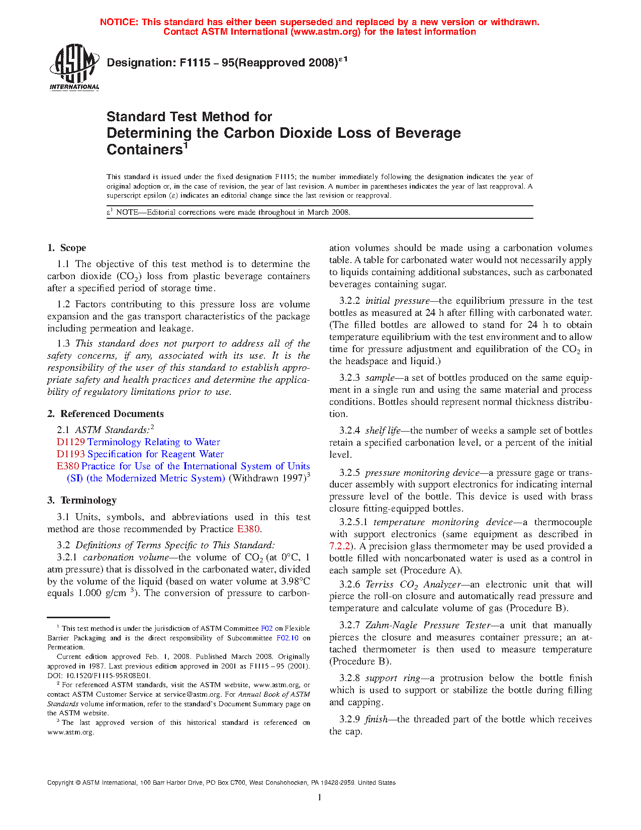 1.1 The objective of this test method is to determine the carbon dioxide (CO2) loss from plastic beverage containers after a specified period of storage time.