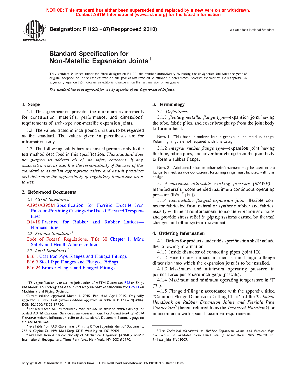 This specification provides the minimum requirements for construction, materials, performance, and dimensions of arch-type non-metallic expansion joints. Expansion joints shall be fabricated with an elastomeric tube reinforced with multiple plies of woven cloth or tire cord covered with synthetic rubber. The inner tube shall be a natural rubber, synthetic rubber, or blend of synthetic rubber. The woven cloth or tire cord shall be nylon, polyester, fiberglass, or aramid, and shall not be cotton. The reinforcing fabric shall be impregnated with a compatible friction stock. Additional reinforcement to the fabric may be provided in the body of the expansion joint and may be solid metal rings or wire embedded in the synthetic rubber. Body rings, if used, must be welded before being installed in the expansion joint body. All expansion joints shall be manufactured with a cover of Hypalon or Neoprene (Chloroprene). The requirements for (1) integral rubber and fabric flanges, (2) floating metal flanges, (3) arches, (4) metallic flanges, (5) retaining rings, and (6) expansion joint cover and body. All expansion joints shall be designed for the specified pressure requirement. Performance requirements for single arch expansion movement and multiple arch-joint movement, as well as the pressure rating, are specified. The following tests shall be performed if required: burst test for prototype testing, hydrostatic test for production testing, and flame resistance test.