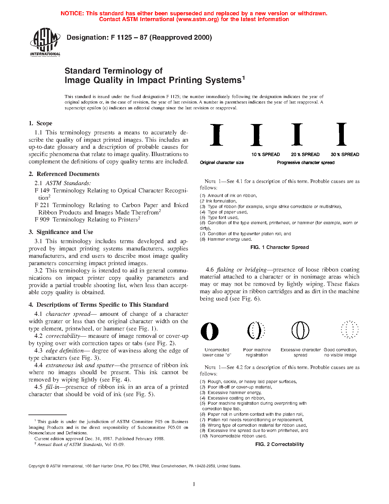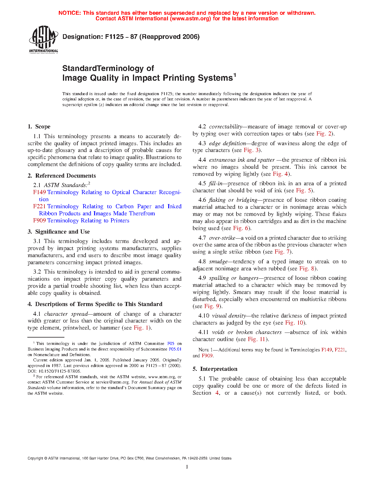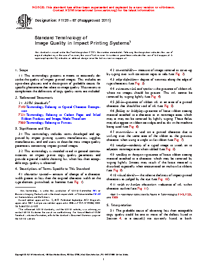 1.1 This terminology presents a means to accurately describe the quality of impact printed images. This includes an up-to-date glossary and a description of probable causes for specific phenomena that relate to image quality. Illustrations to complement the definitions of copy quality terms are included.