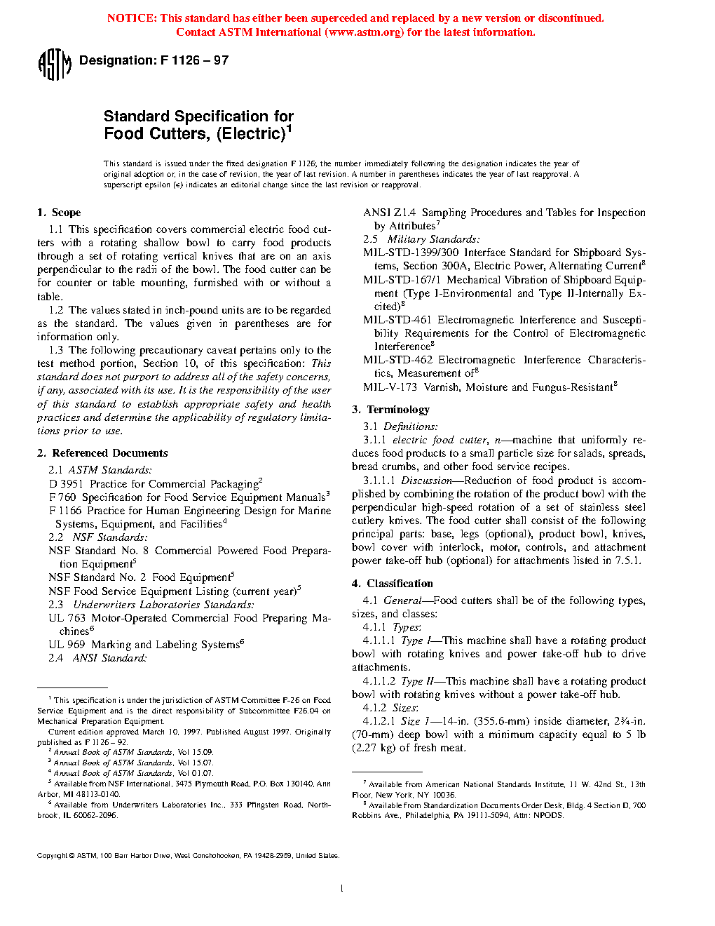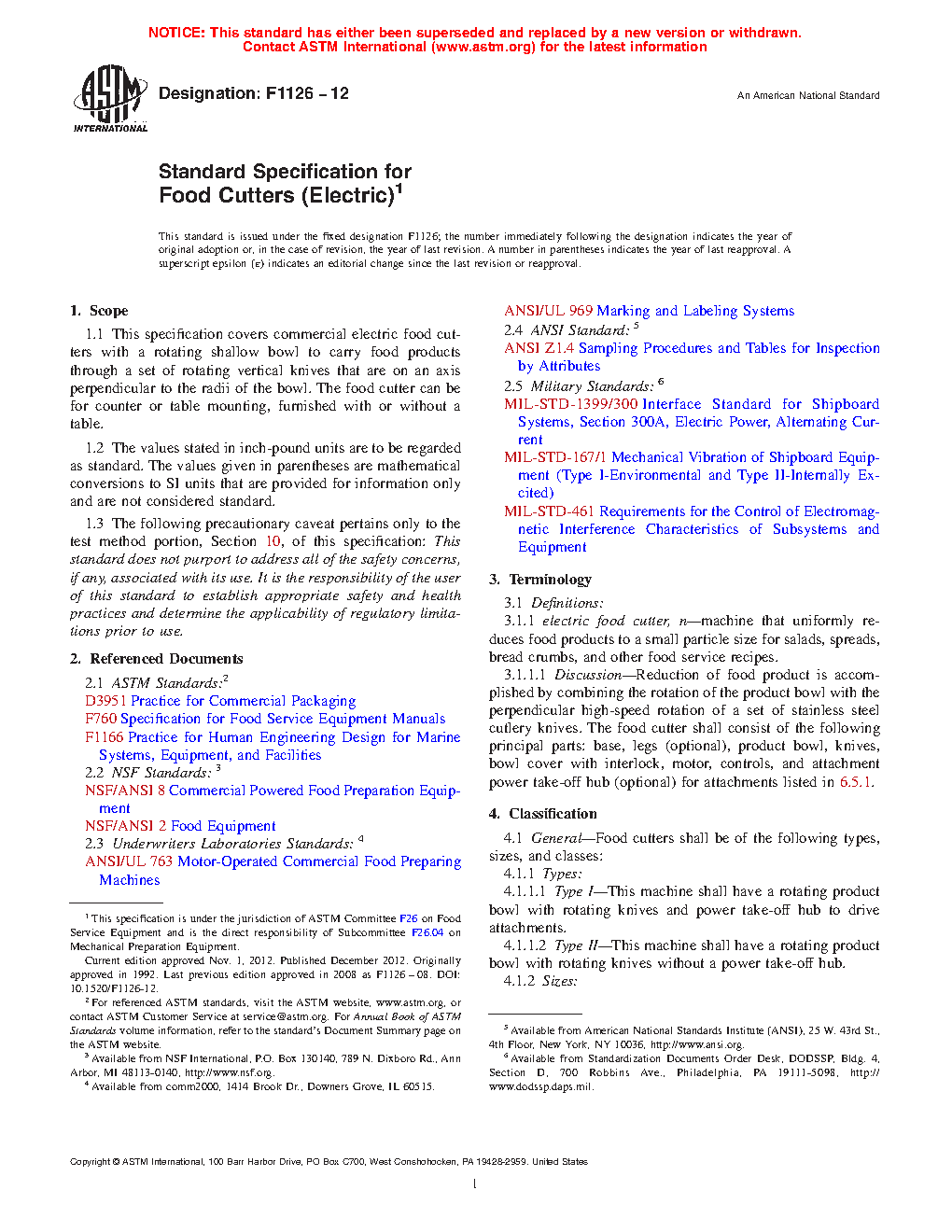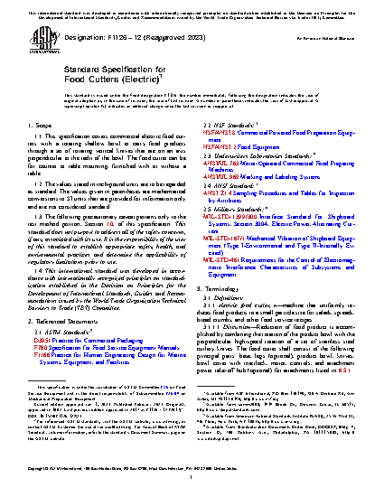 1.1 This specification covers commercial electric food cutters with a rotating shallow bowl to carry food products through a set of rotating vertical knives that are on an axis perpendicular to the radii of the bowl. The food cutter can be for counter or table mounting, furnished with or without a table.