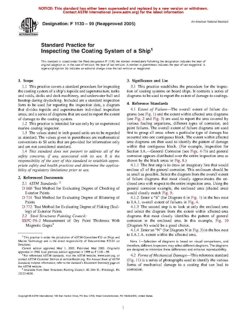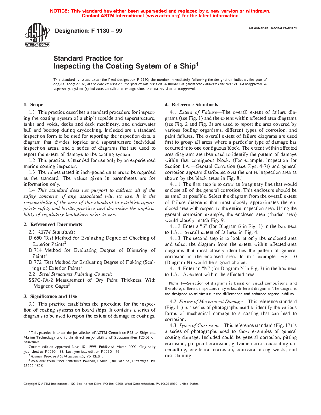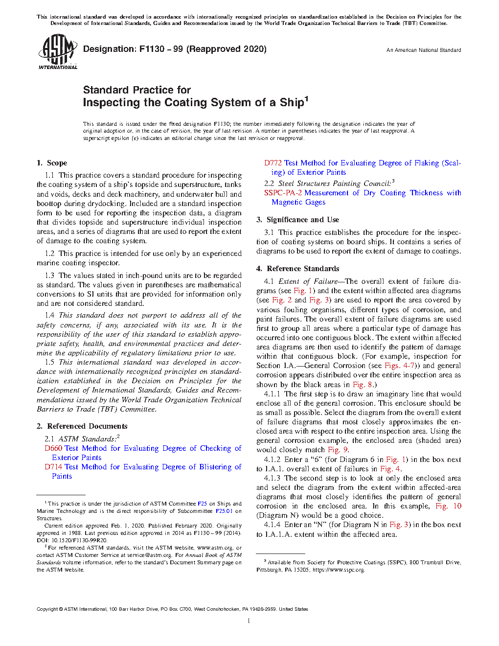 3.1 This practice establishes the procedure for the inspection of coating systems on board ships. It contains a series of diagrams to be used to report the extent of damage to coatings.
