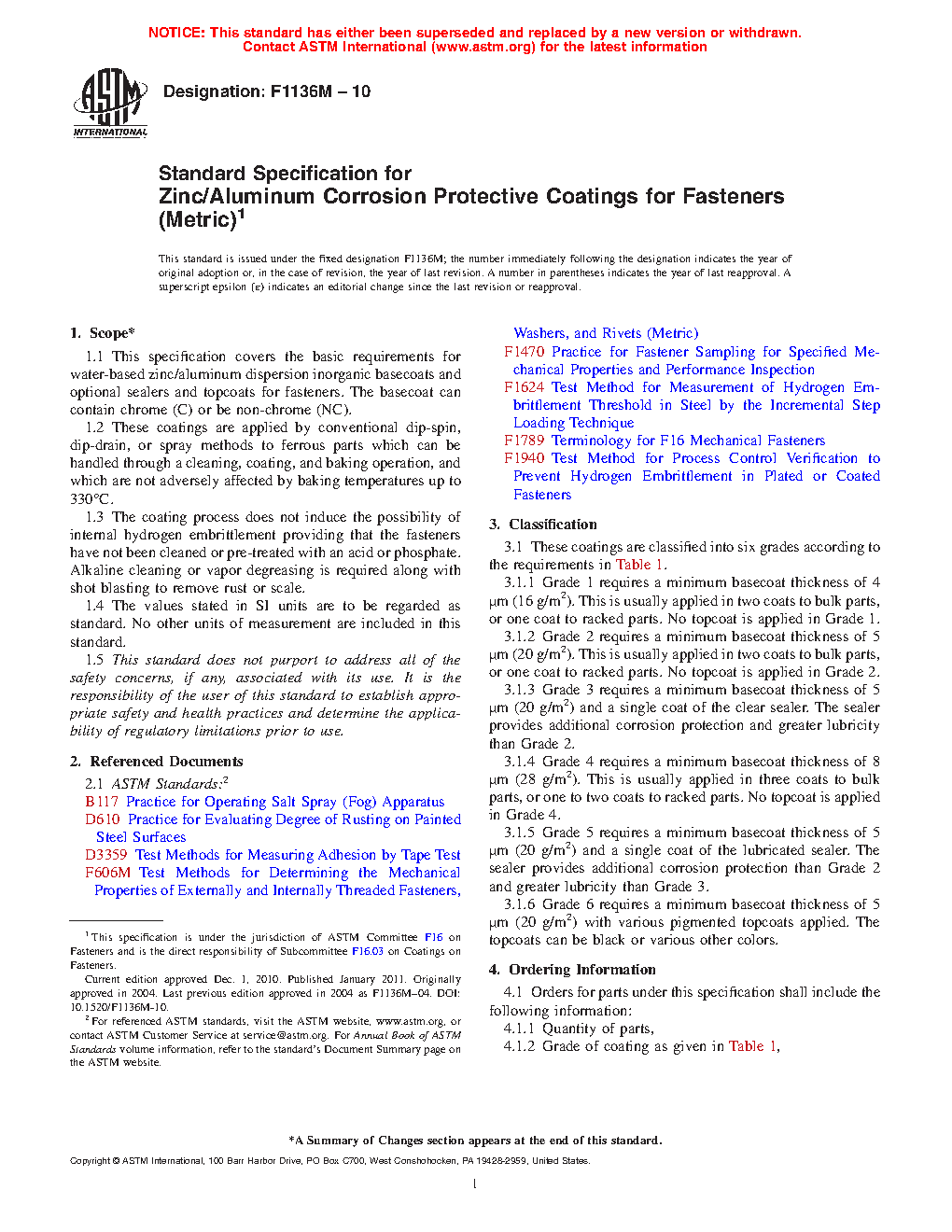 This specification covers the basic requirements and associated test methods for water-based corrosion protective zinc/aluminum dispersion inorganic basecoats, and optional sealers and topcoats for fasteners. The basecoat can contain chrome (C) or be non-chrome (NC). These coatings are applied to ferrous parts by conventional dip-spin, dip-drain, or spray methods, which can be handled through a cleaning, coating, and baking operation, and which are not adversely affected by baking temperatures up to 330 °C. The coatings are classified into six grades (Grades 1 to 6) according to the required minimum basecoat thickness, and when tested, shall conform accordingly to appearance, adhesion, corrosion resistance, blister, thread fit, and hydrogen embrittlement requirements. The coating process does not induce the possibility of internal hydrogen embrittlement provided that the fasteners have not been cleaned or pre-treated with an acid or phosphate. Alkaline cleaning or vapor degreasing is required along with shot blasting to remove rust or scale. In this specification, units are presented in the metric scale.