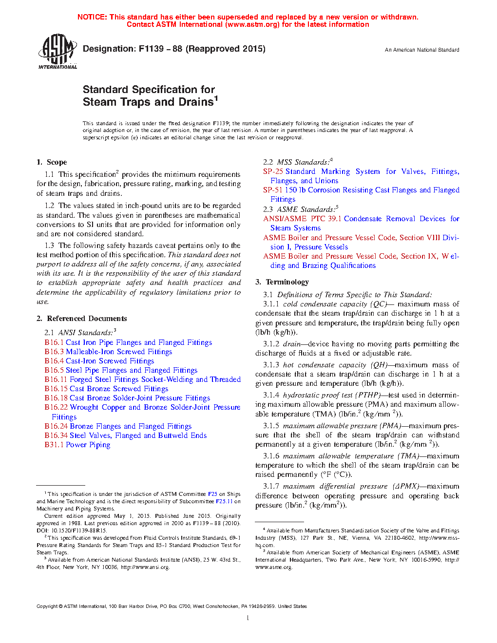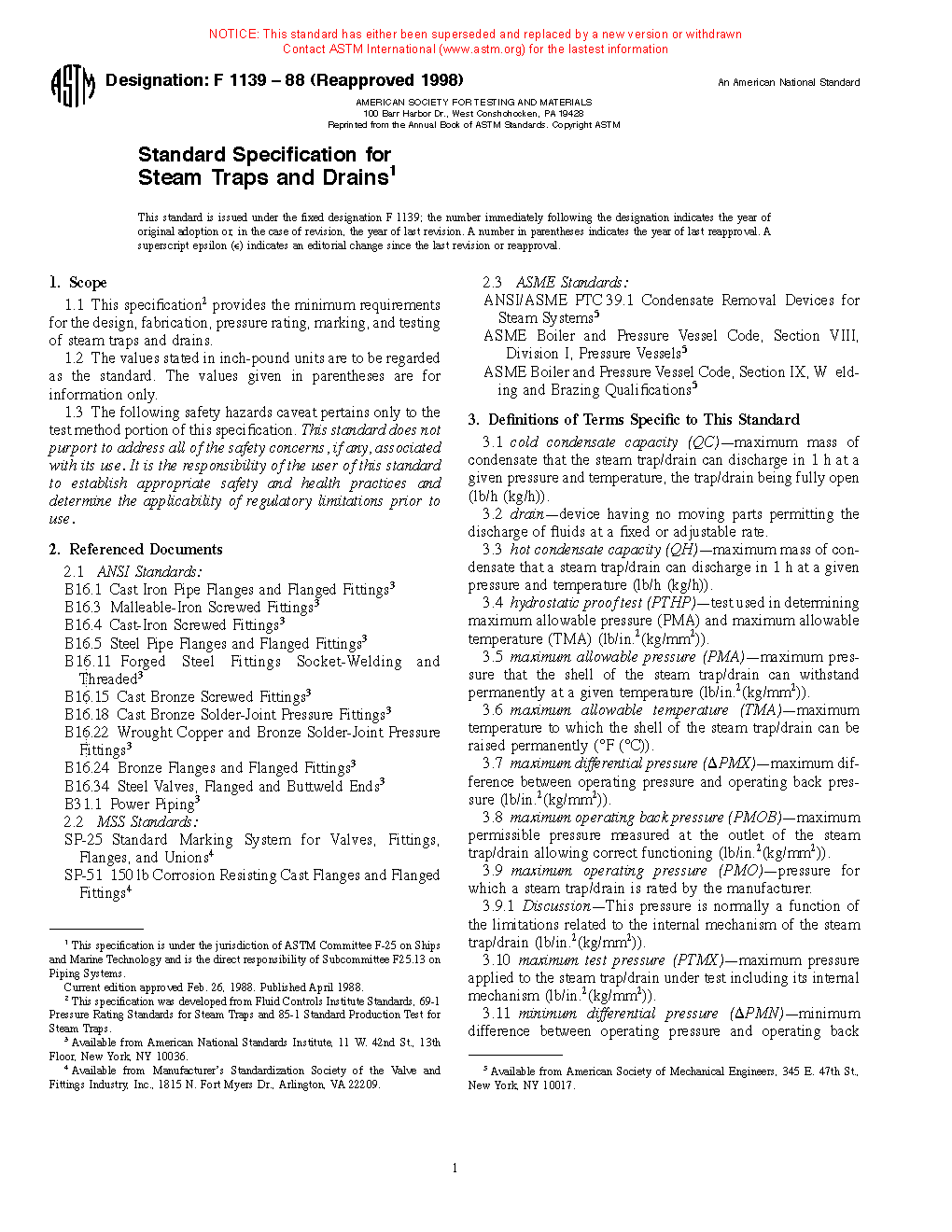 1.1 This specification provides the minimum requirements for the design, fabrication, pressure rating, marking, and testing of steam traps and drains.