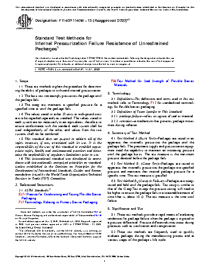 1.1 These test methods explain the procedure for determining the ability of packages to withstand internal pressurization.
