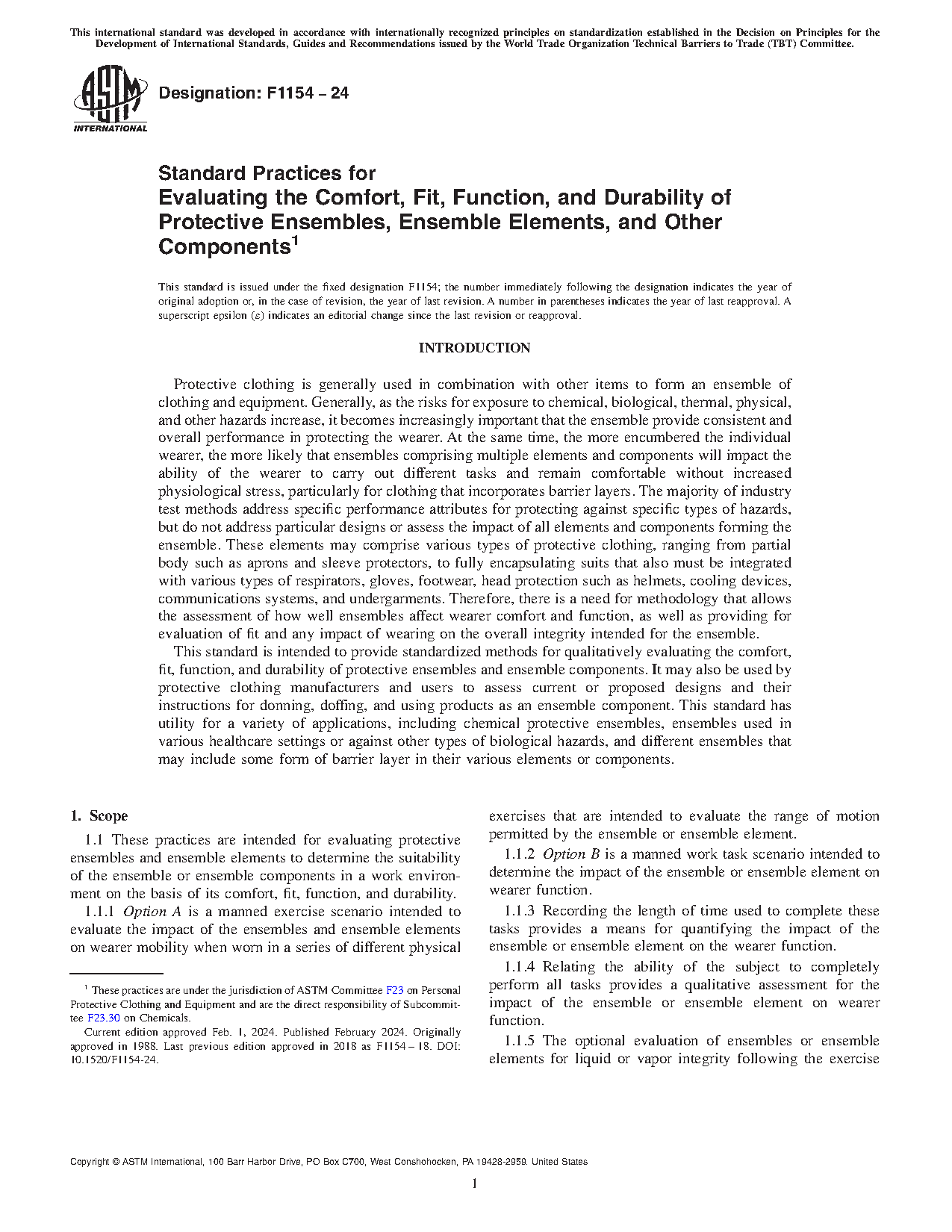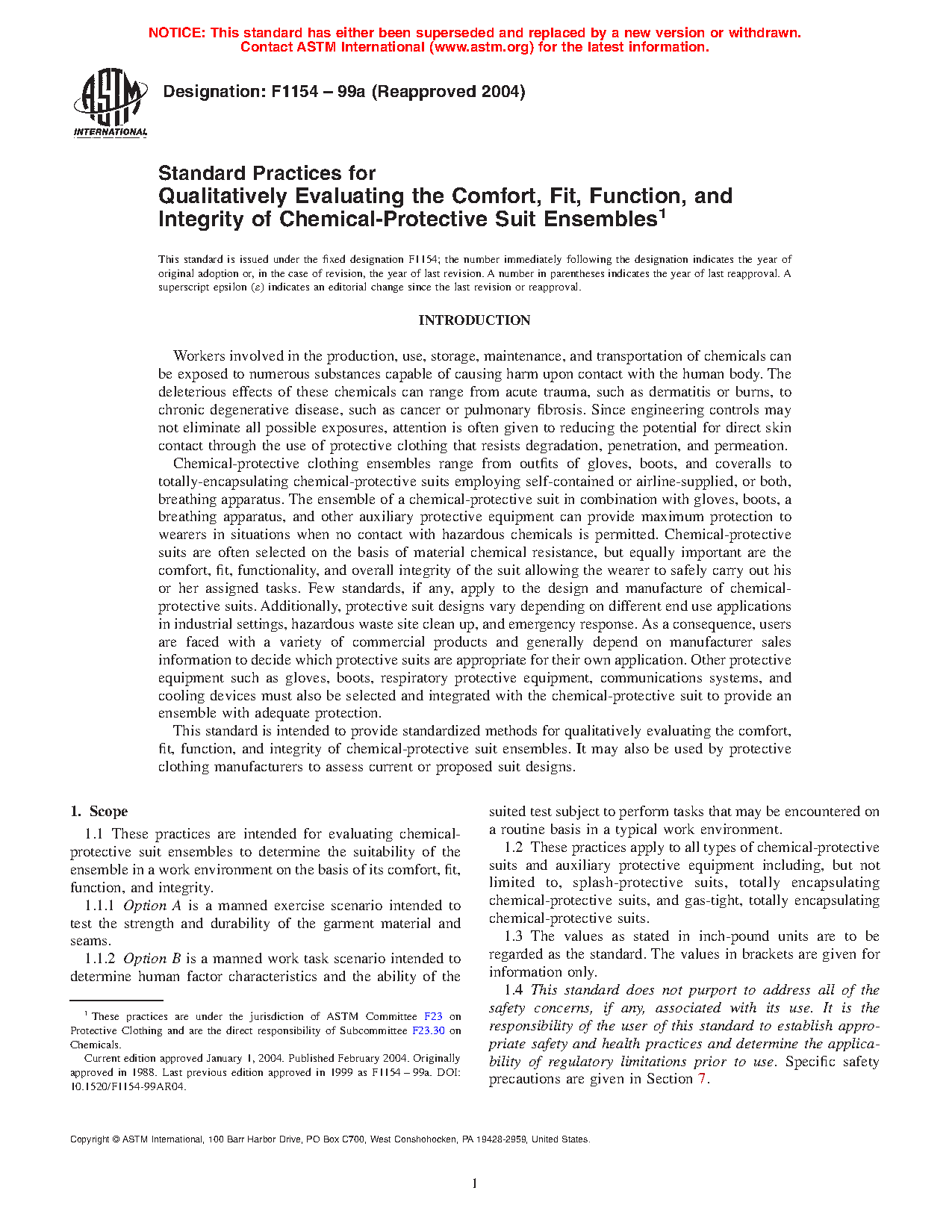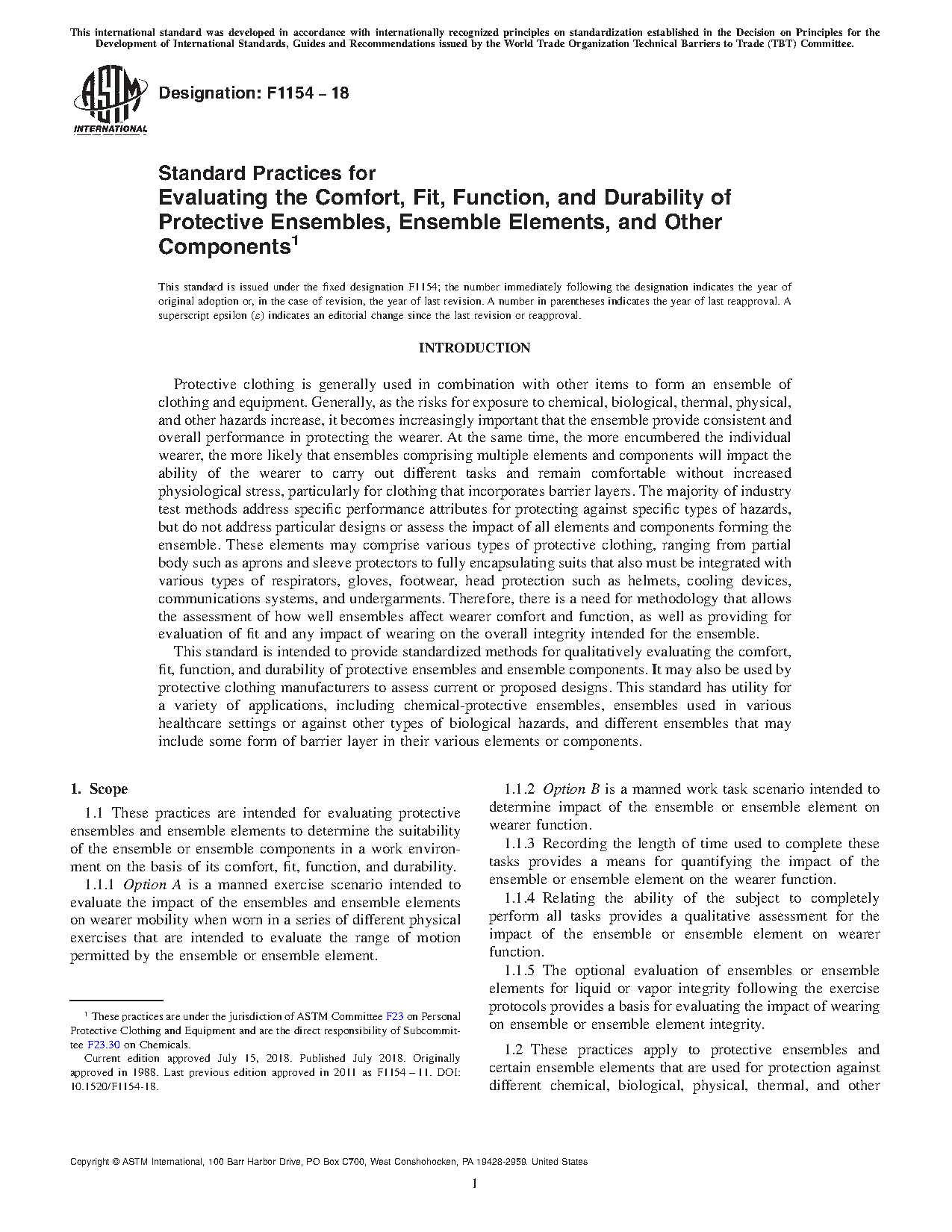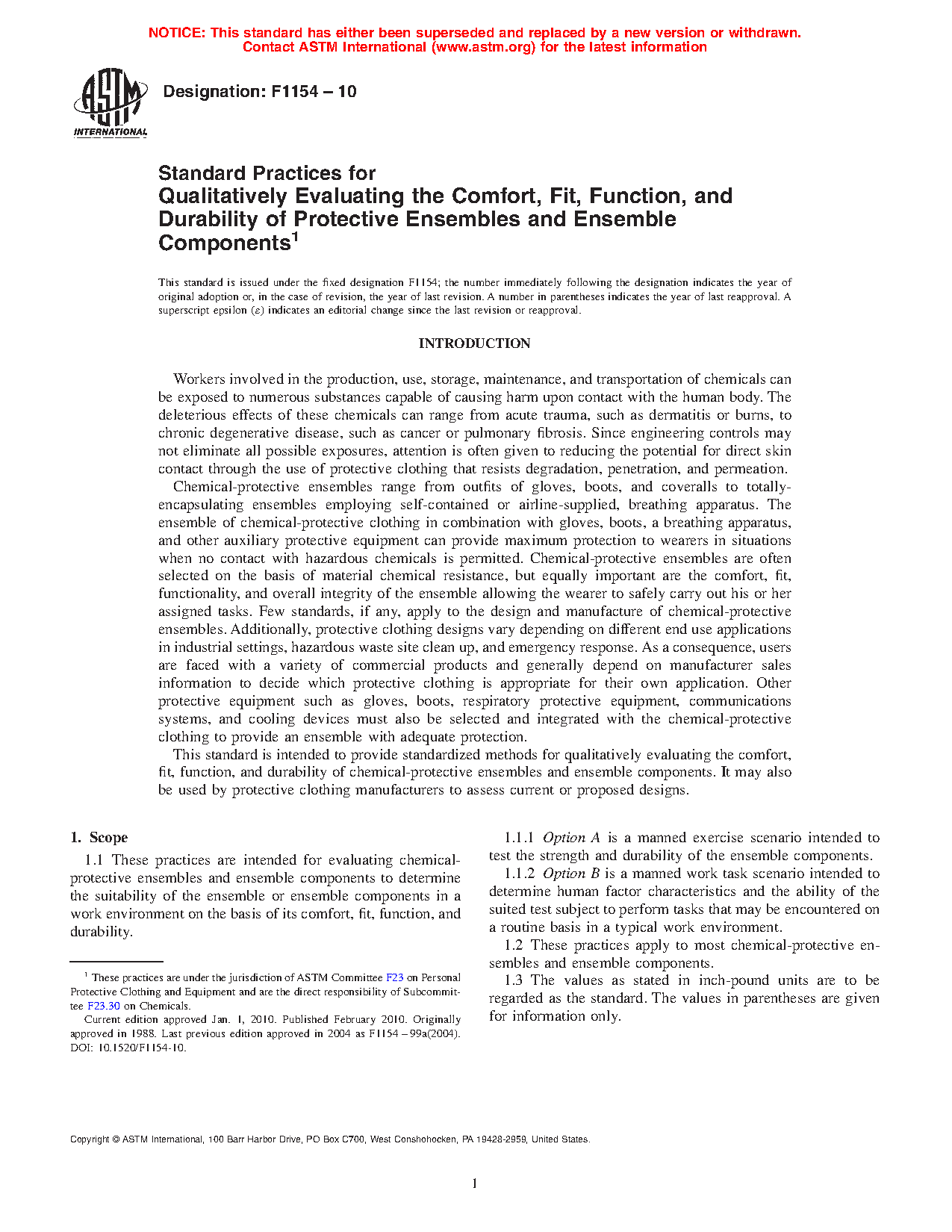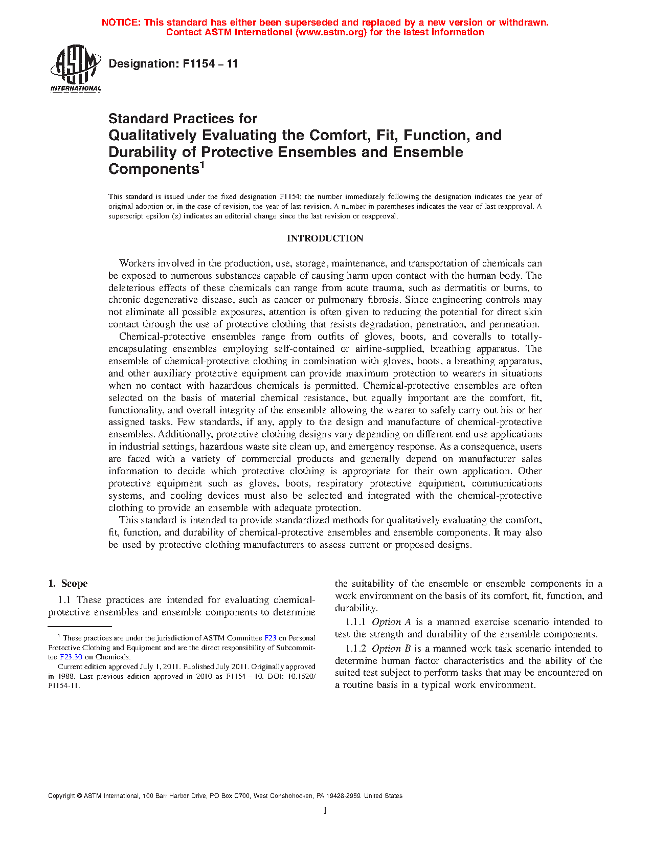 1.1 These practices are intended for evaluating protective ensembles and ensemble elements to determine the suitability of the ensemble or ensemble components in a work environment on the basis of its comfort, fit, function, and durability.