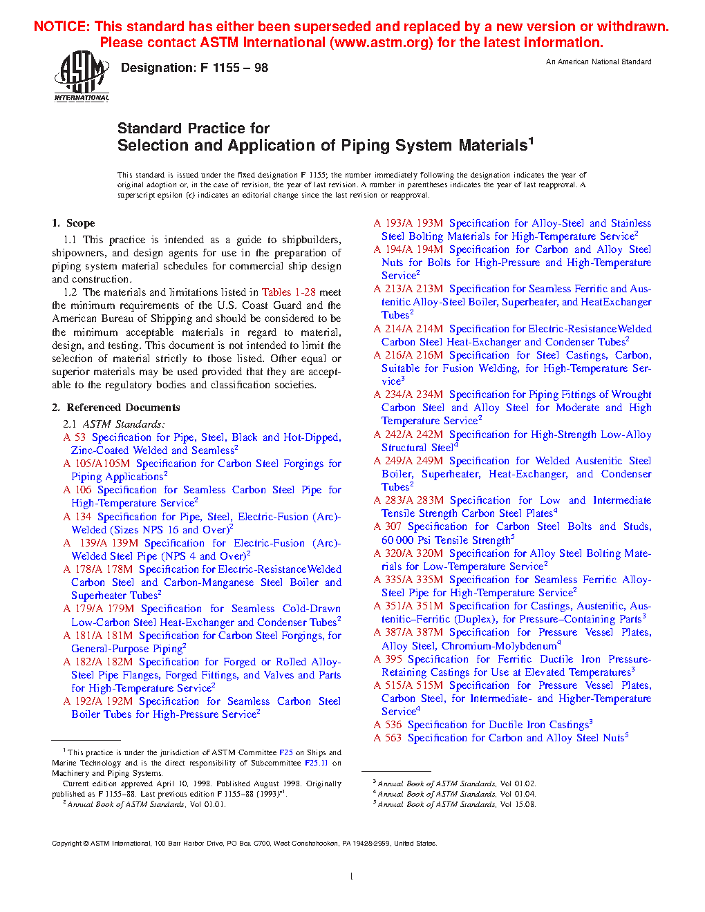 This practice is intended as a guide to shipbuilders, shipowners, and design agents for use in the preparation of piping system material schedules for commercial ship design and construction. The materials and limitations listed in this specification meet the minimum requirements of the U.S. Coast Guard and the American Bureau of Shipping and should be considered to be the minimum acceptable materials in regard to material, design, and testing.