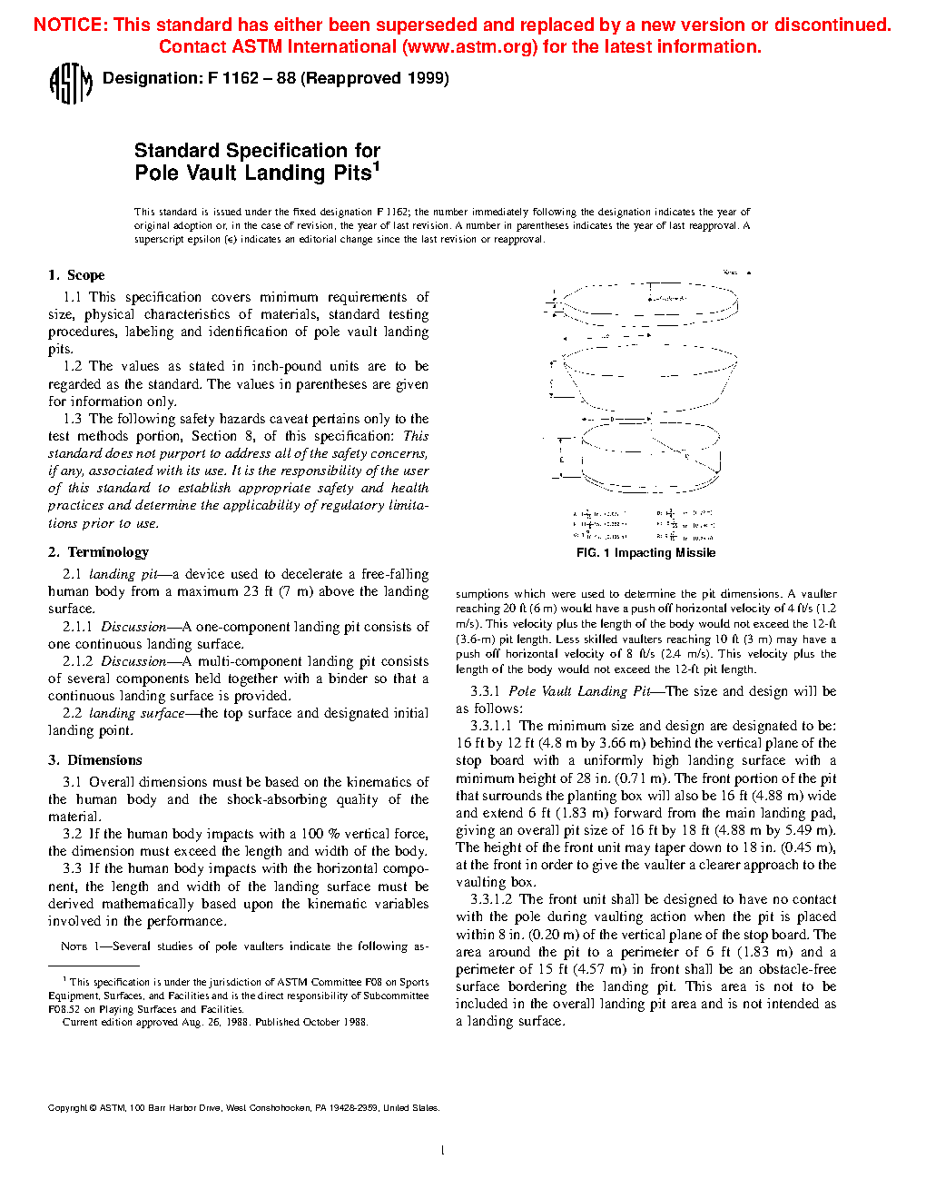 1.1 This specification covers minimum requirements of size, physical characteristics of materials, standard testing procedures, labeling and identification of pole vault landing pads intended for users up to 19 ft (5.74 m).