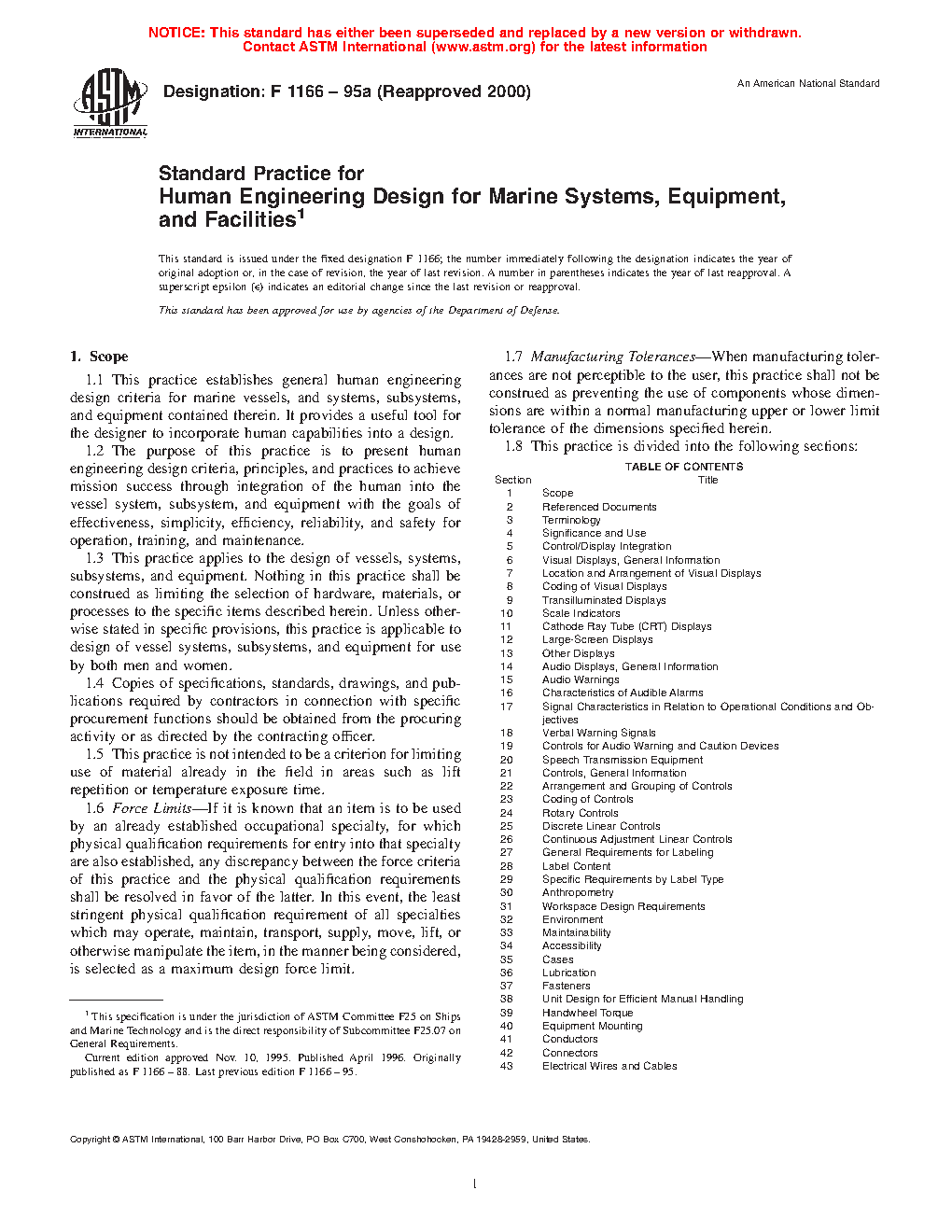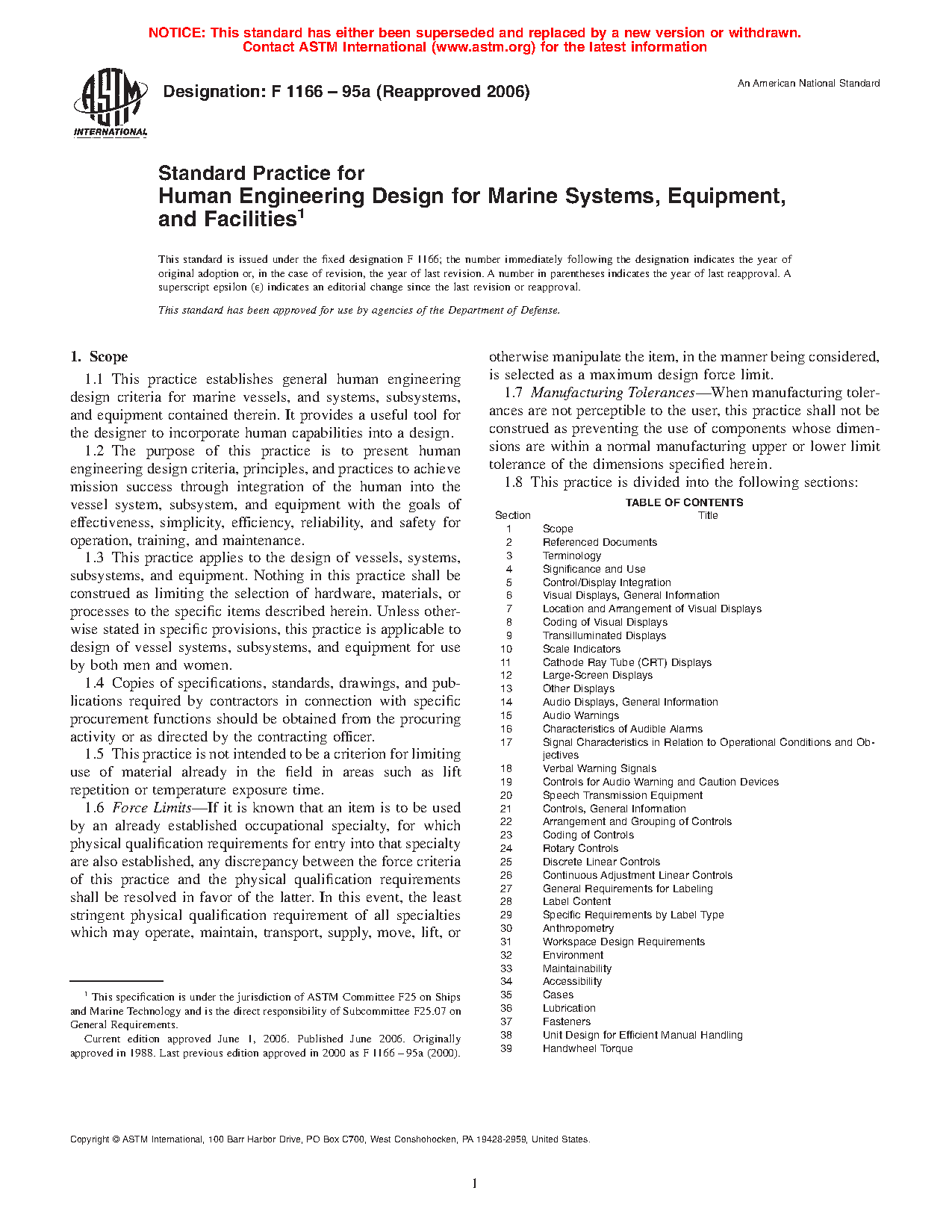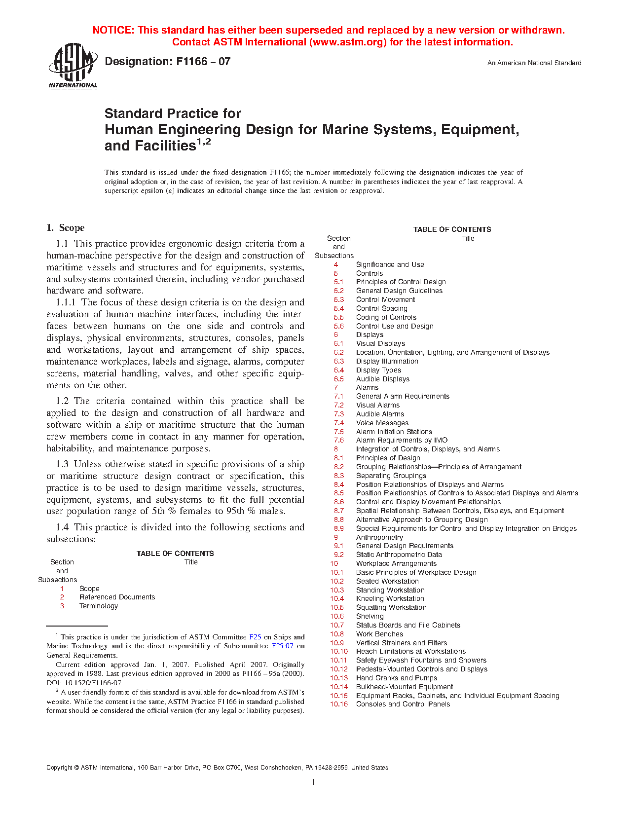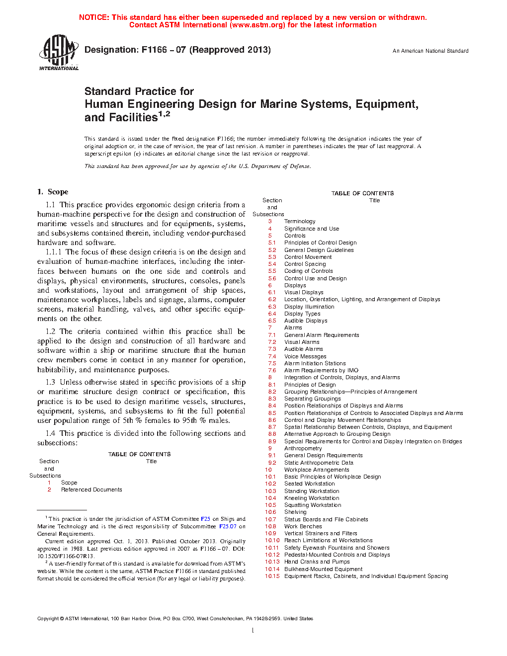 1.1 This practice provides ergonomic design criteria from a human-machine perspective for the design and construction of maritime vessels and structures and for equipment, systems, and subsystems contained therein, including vendor-purchased hardware and software.
