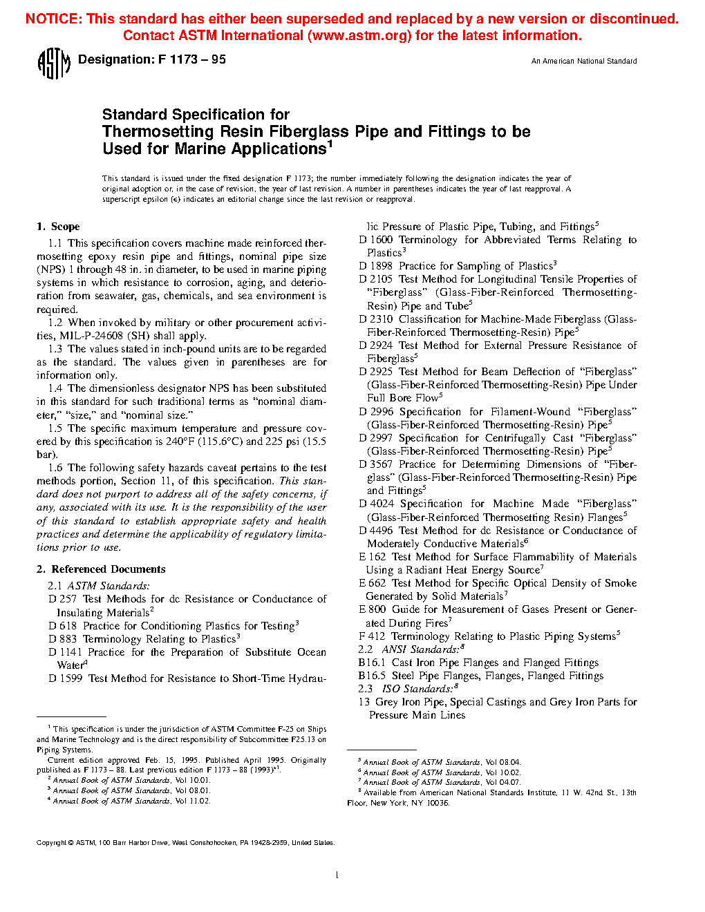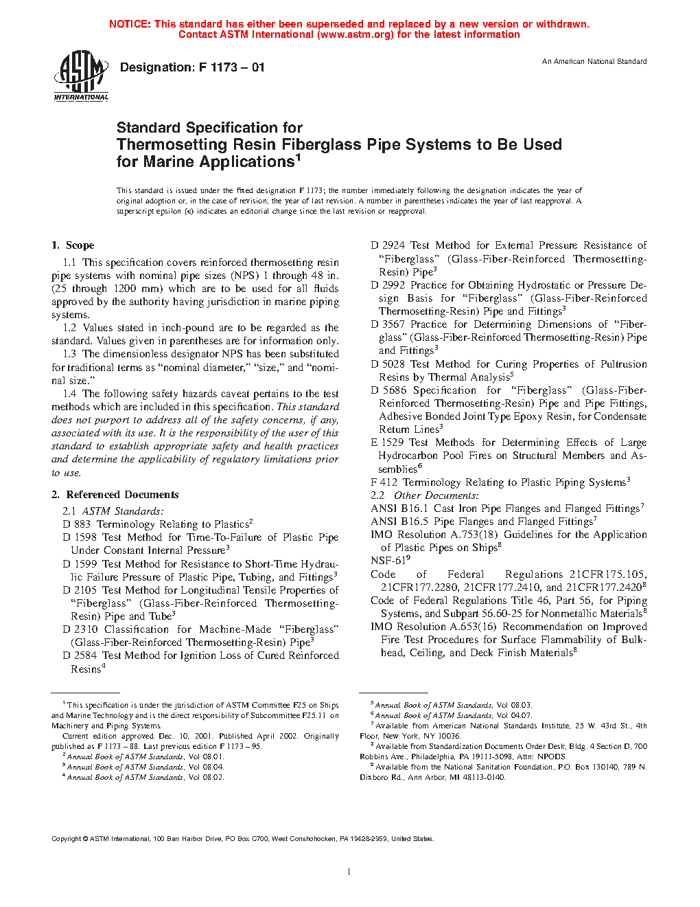 1.1 This specification covers reinforced thermosetting resin pipe systems with nominal pipe sizes (NPS) 1 in. through 48 in. (25 mm through 1200 mm) which are to be used for all fluids approved by the authority having jurisdiction in marine piping systems.