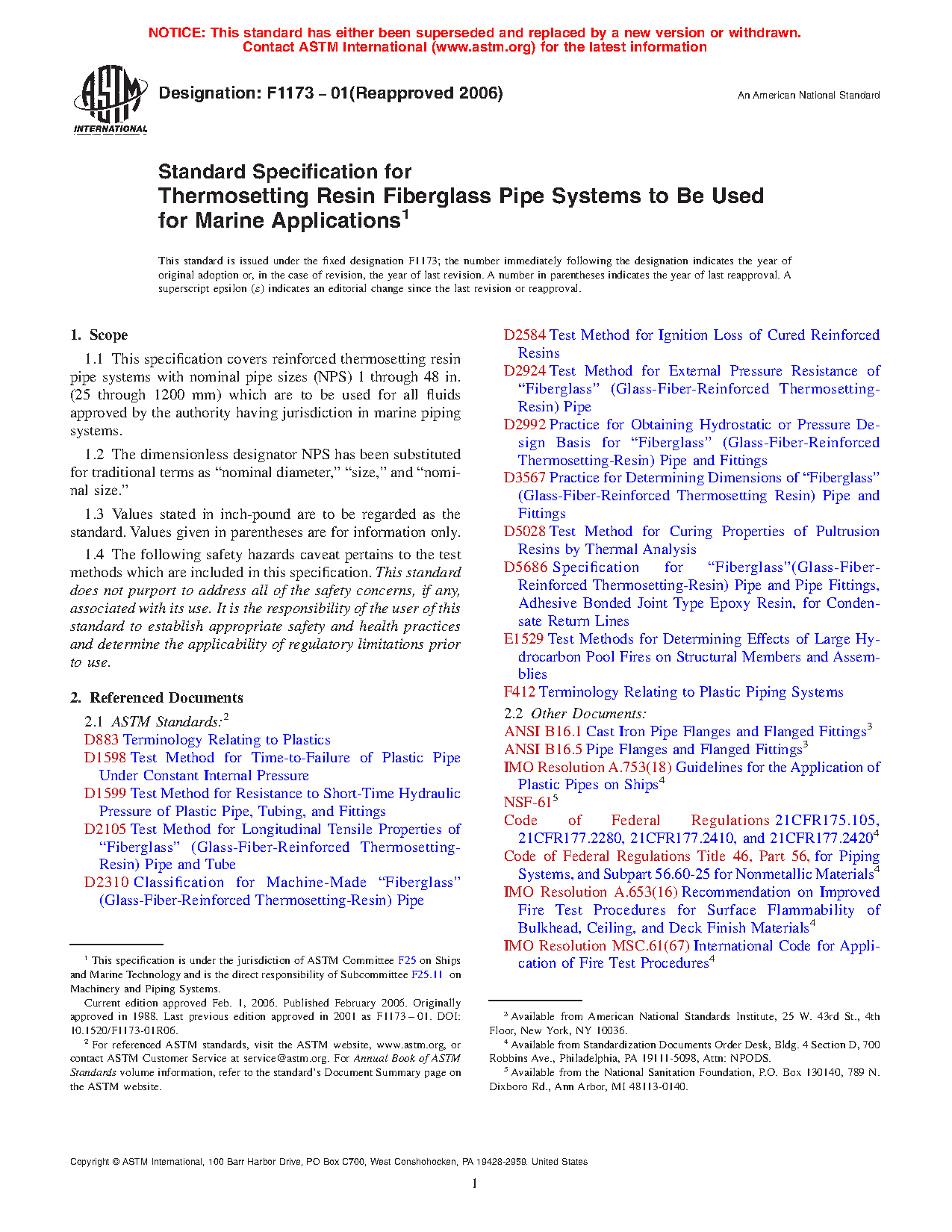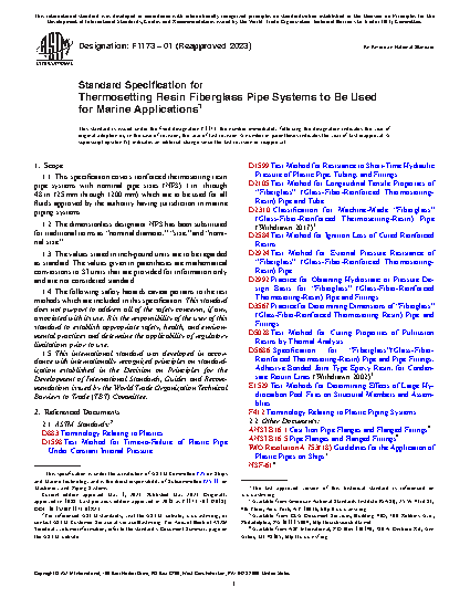 This specification covers the classifications of and basic requirements for thermosetting fiberglass reinforced resin pipe systems with nominal pipe sizes (NPS) 1 through 48 in. (25 through 1200 mm) which are to be used for all fluids approved by the authority having jurisdiction in marine piping systems. The piping system shall adhere to specified requirements such as internal and external pressure, fire endurance, flame spread, smoke and other toxic products of combustion, temperature, material compatibility, electrical resistance, static charge shielding, potable water usage, glass content, and wall thickness.