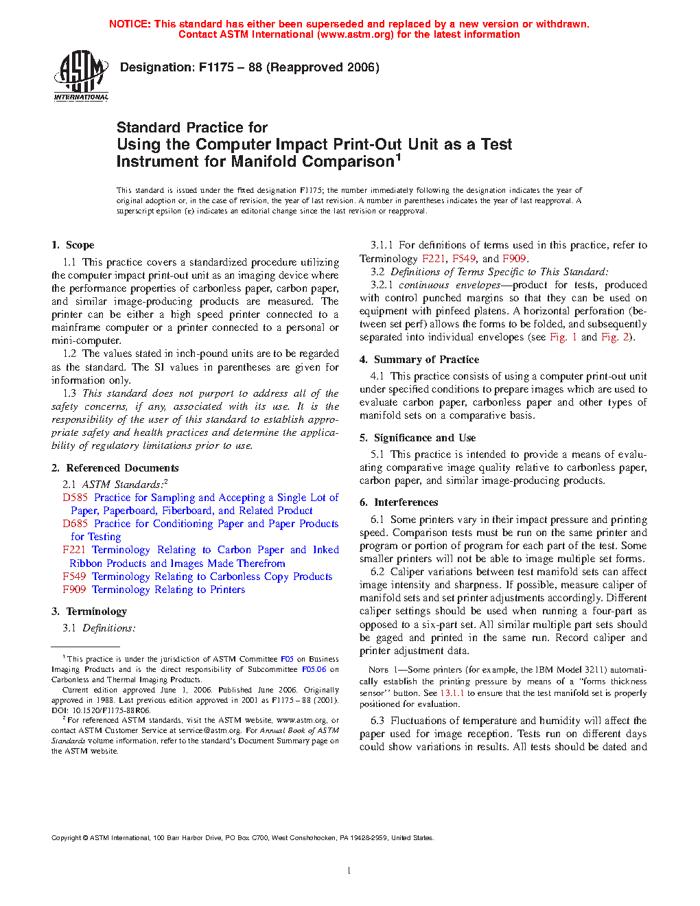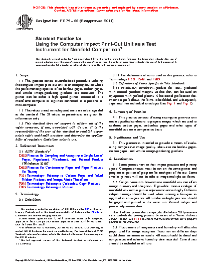 1.1 This practice covers a standardized procedure utilizing the computer impact print-out unit as an imaging device where the performance properties of carbonless paper, carbon paper, and similar image-producing products are measured. The printer can be either a high speed printer connected to a mainframe computer or a printer connected to a personal or mini-computer.