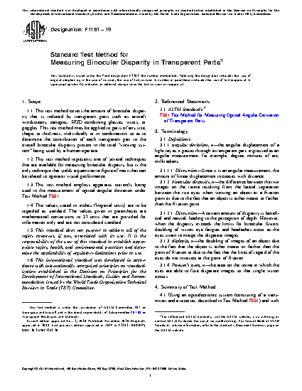 1.1 This test method covers the amount of binocular disparity that is induced by transparent parts such as aircraft windscreens, canopies, HUD combining glasses, visors, or goggles. This test method may be applied to parts of any size, shape, or thickness, individually or in combination, so as to determine the contribution of each transparent part to the overall binocular disparity present in the total “viewing system” being used by a human operator.