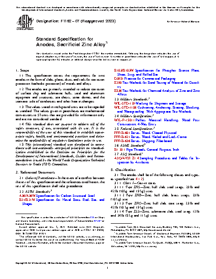 1.1 This specification covers the requirements for zinc anodes in the form of slabs, plates, discs, and rods for corrosion protection (cathodic protection) of metals and alloys.